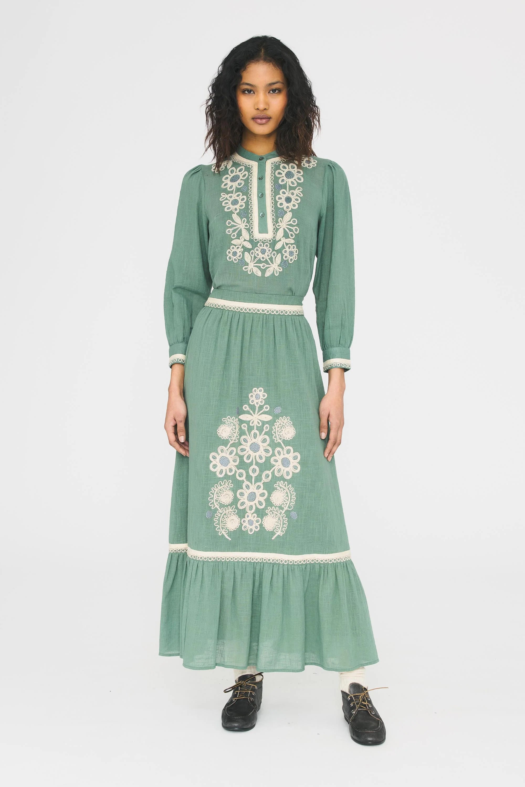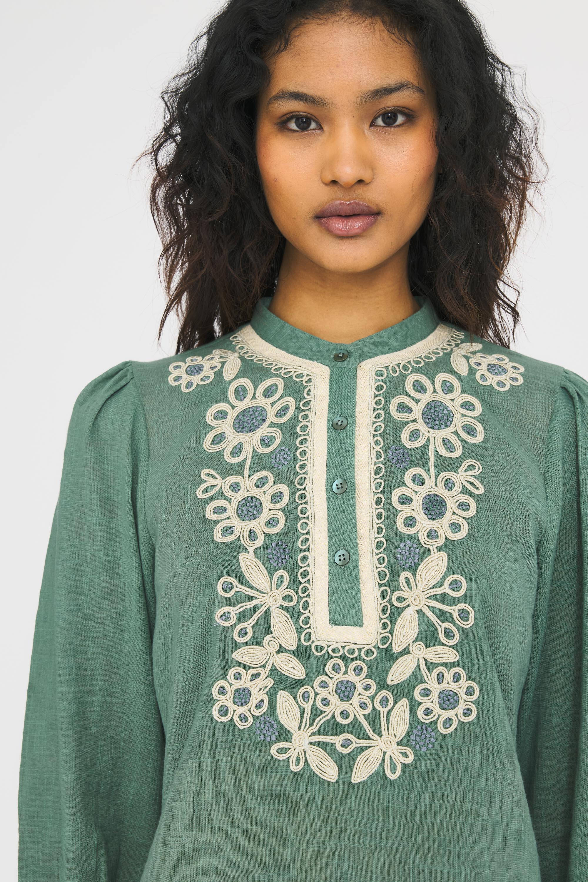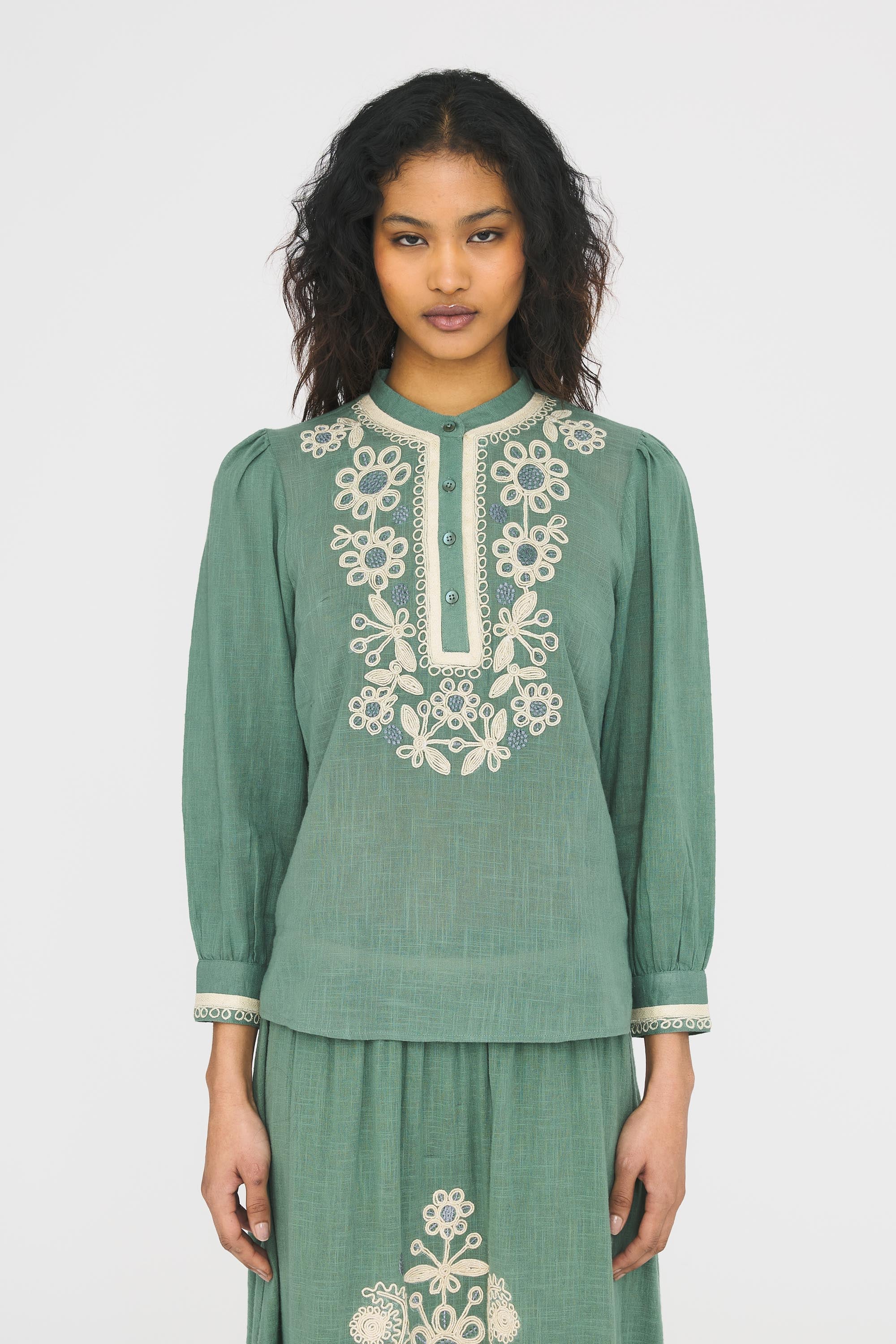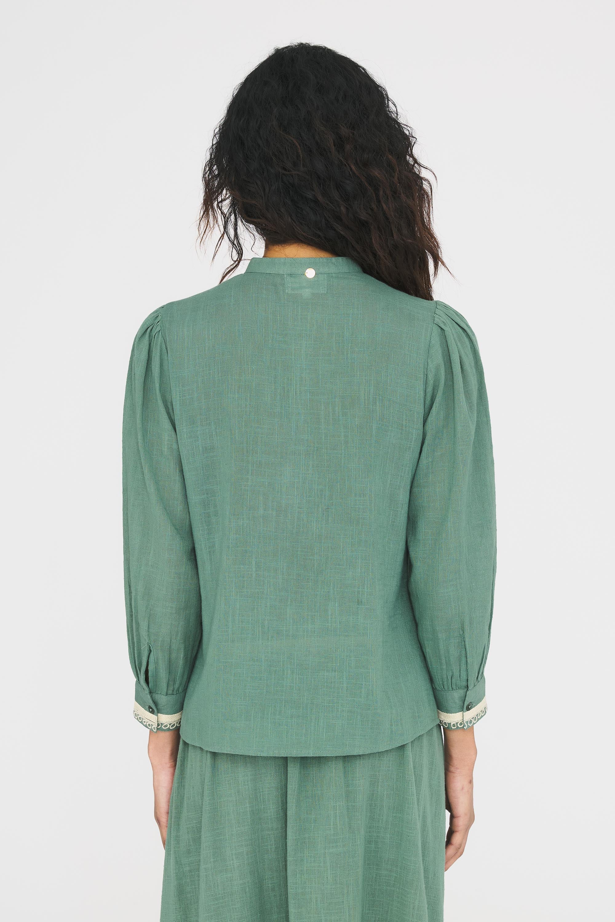 Handcrafted cotton blouse with lurex thread embroidery. Cotton braid applied to the collar, button placket, front, and armholes. Long sleeves. Blue green.