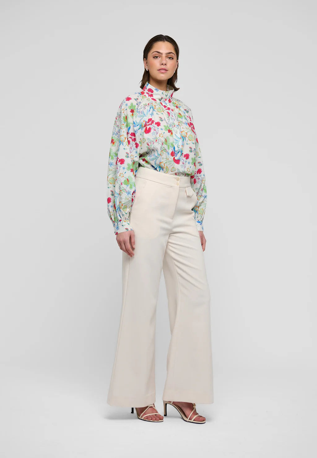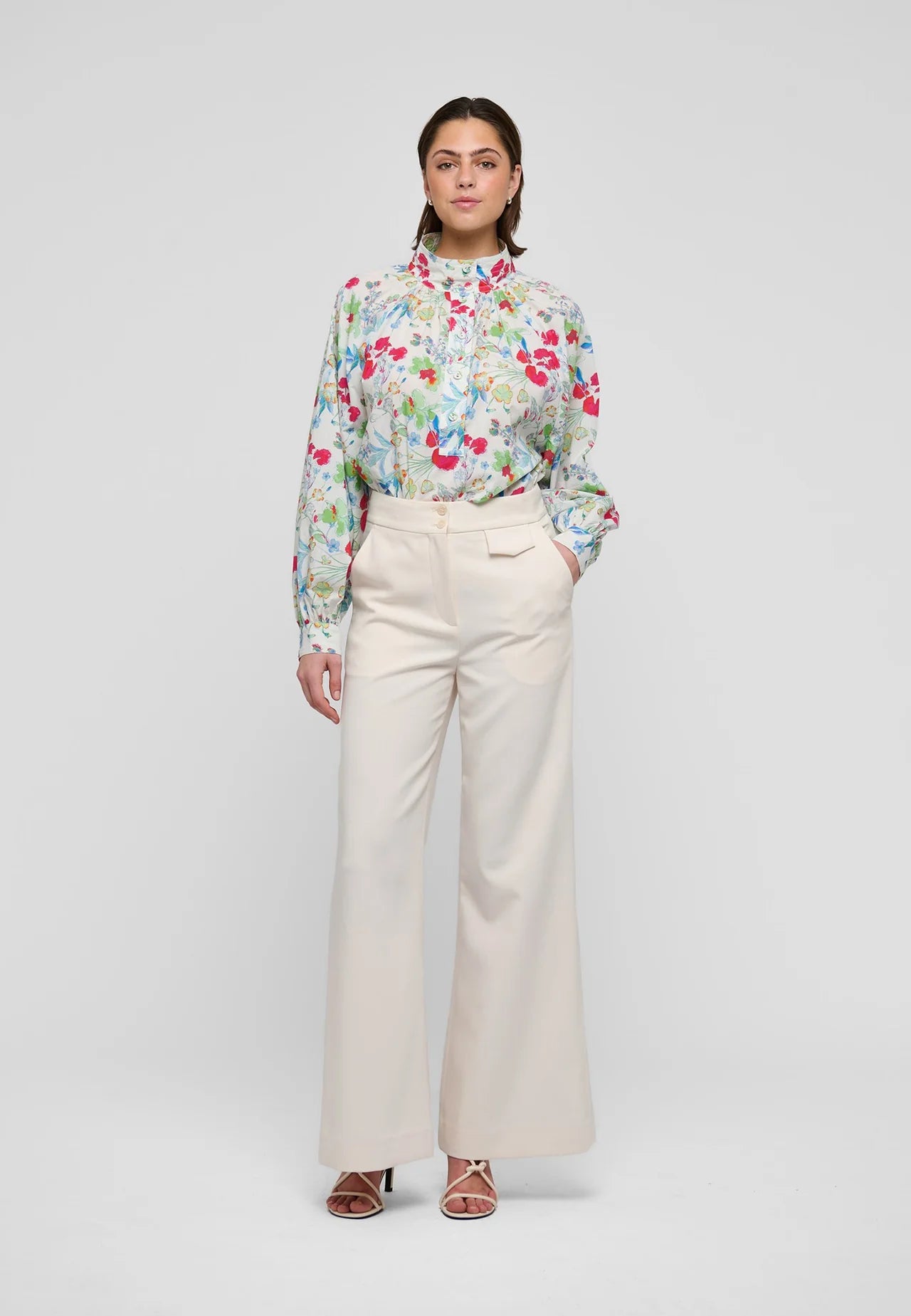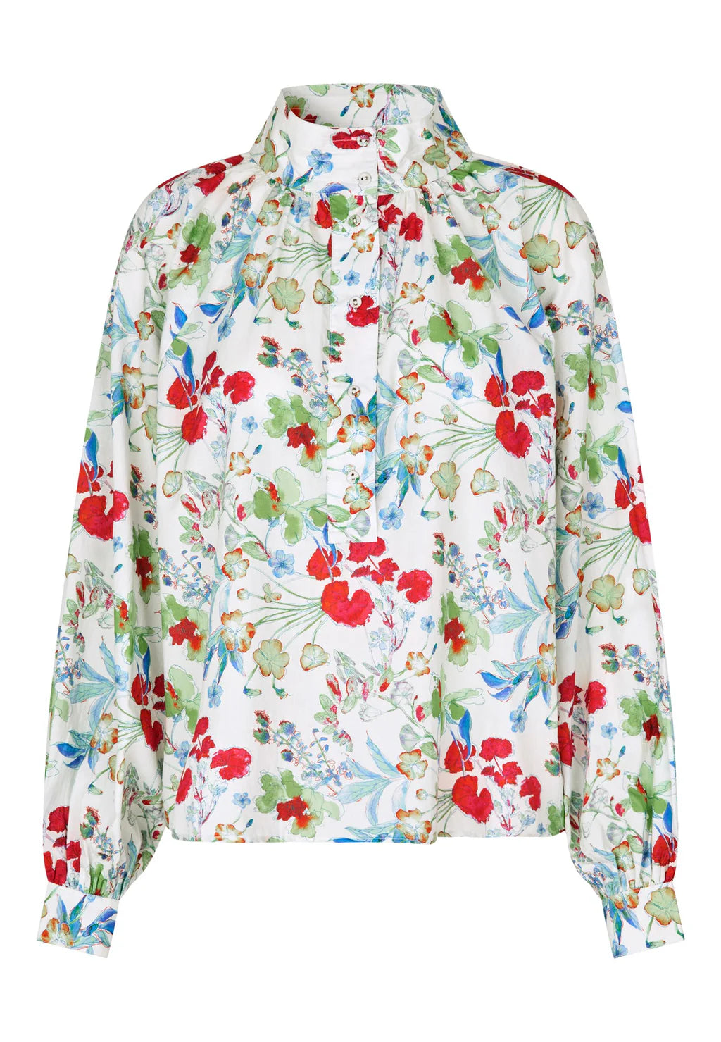 Tiny tucks gather the body into the multi-stitched high stand collar of this loose fit raglan sleeved blouse. The cotton voile fabric printed with brightly colored flowers and covered buttons add a spring like attitude.