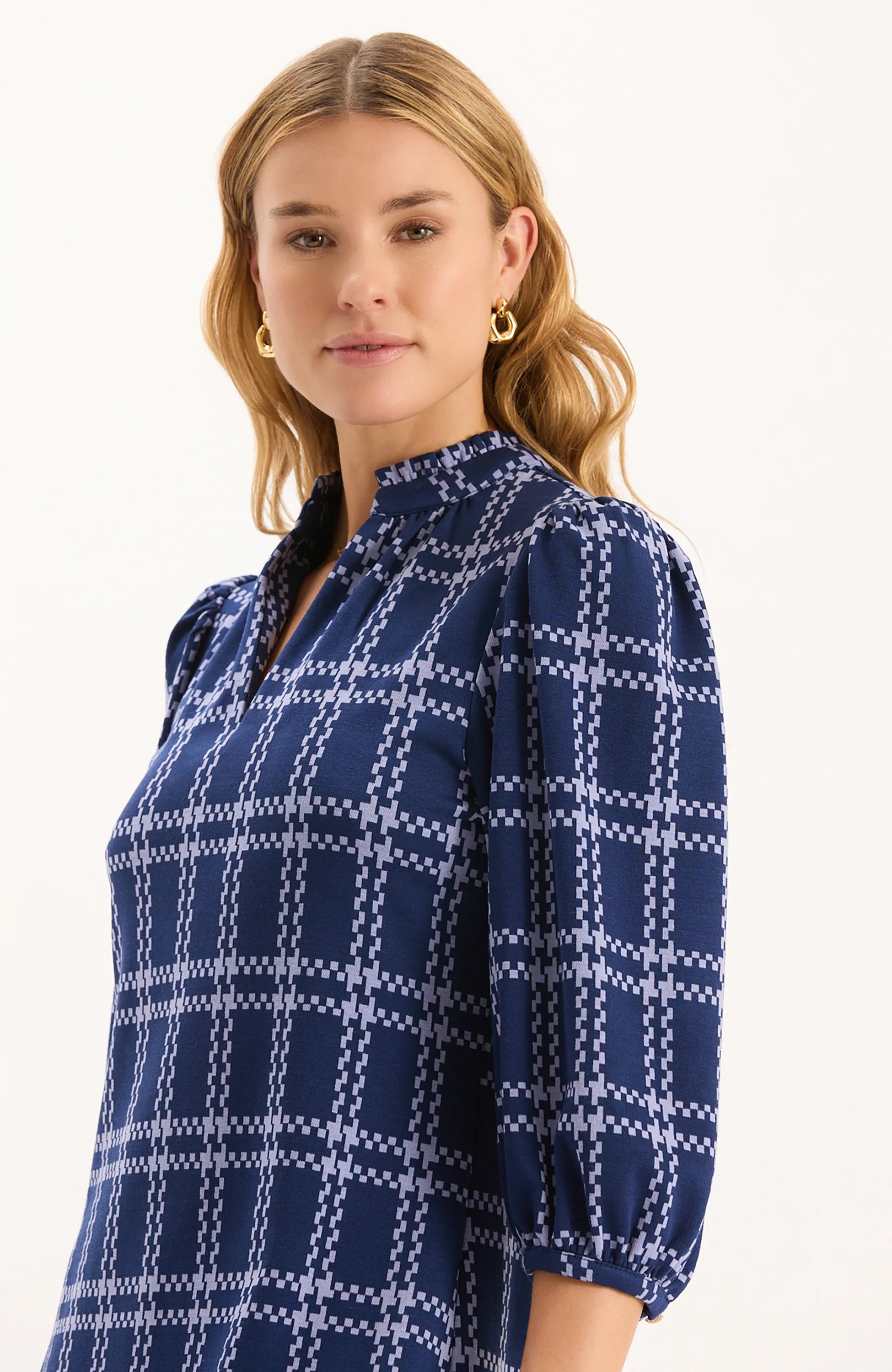 The Sherri dress is made from Tyler Boe's signature, wrinkle-free knit fabric for all-day comfort. The design features a notch neckline, three-quarter puff sleeves, and a streamlined shape that offers a flattering, easy fit. It’s a go-to style that works from day to night and transitions seamlessly through the seasons.