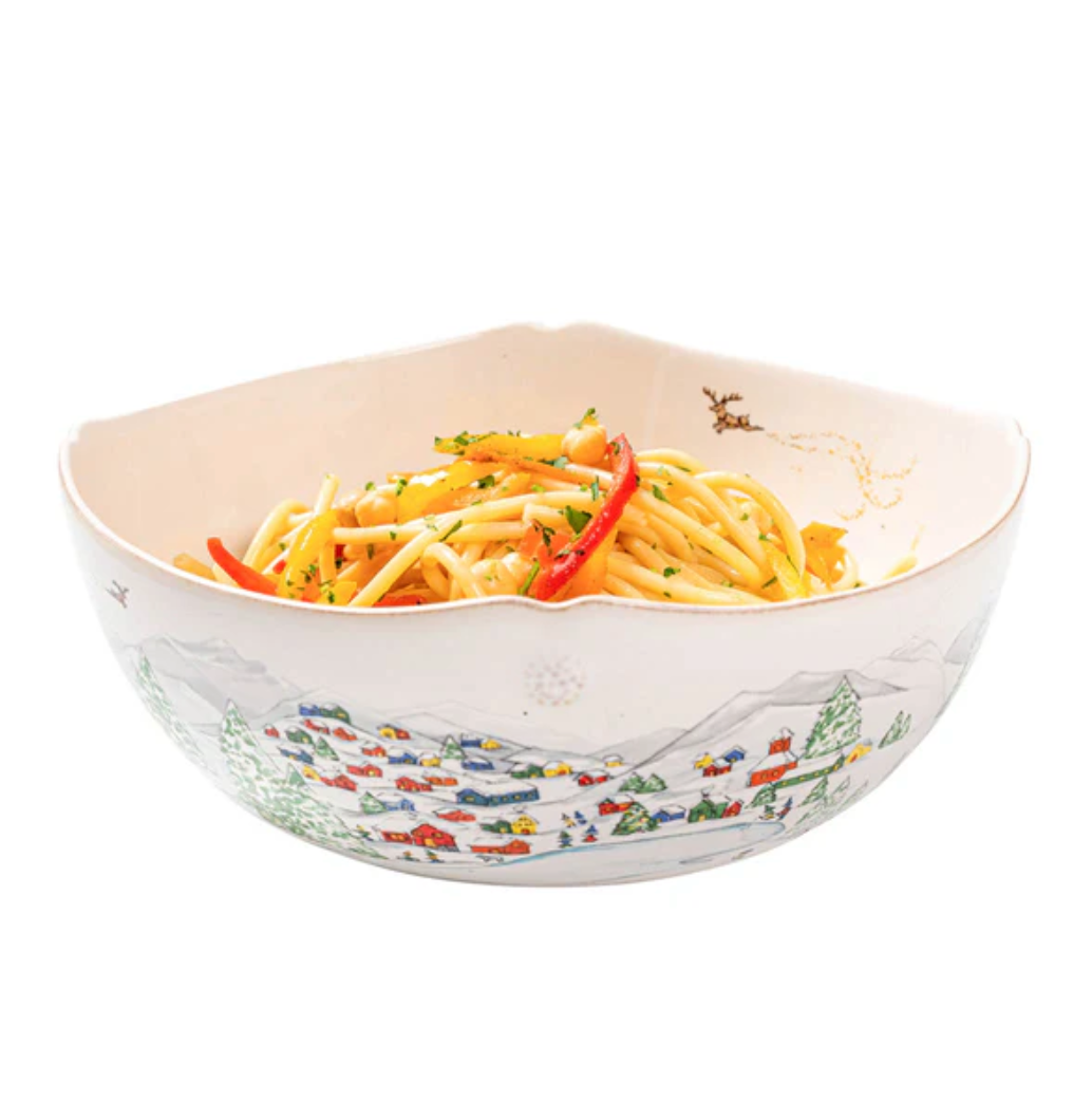 The mythical, folkloric world of the North Pole is hand illustrated atop Juliska's iconic Berry & Thread shapes in this new holiday collection. Find the elves’ village and Santa’s cottage depicted on this serving bowl with subtle scallop and berry detail along its edge. Ceramic made in Portugal. Dishwasher, microwave, oven, and freezer safe.