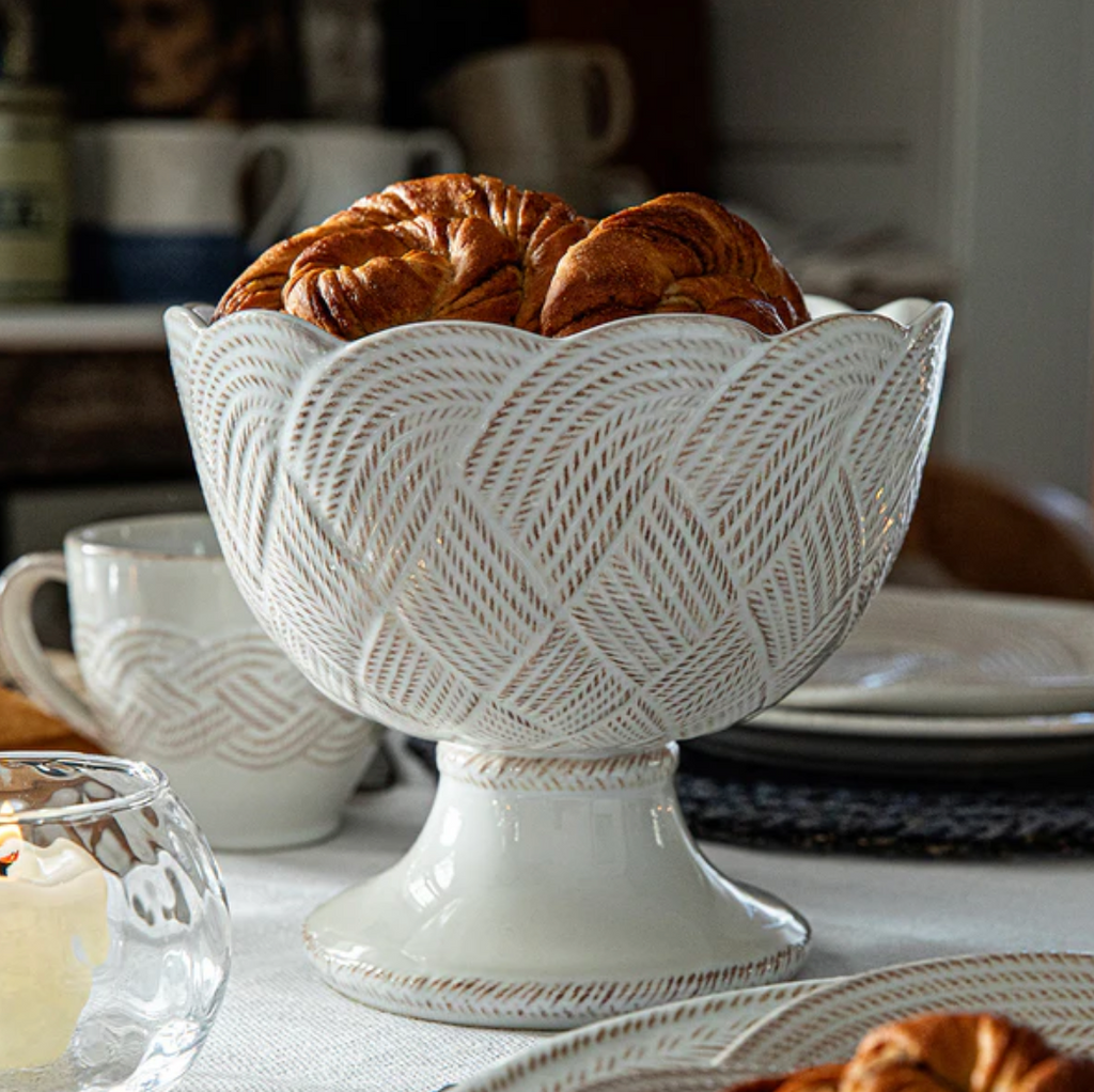Bring warmth to the table or countertop with Juliska's footed bowl that features its timeless Mystic Knot motif of intricate, interwoven braiding that is richly textural and endlessly beautiful. Evoking the weathered and rustic character of a seaside cottage, the soft whitewash finish works just as well in modern spaces to display everything from fruit to desserts to fresh-baked bread. Ceramic made in Portugal. Dishwasher, microwave and oven safe.