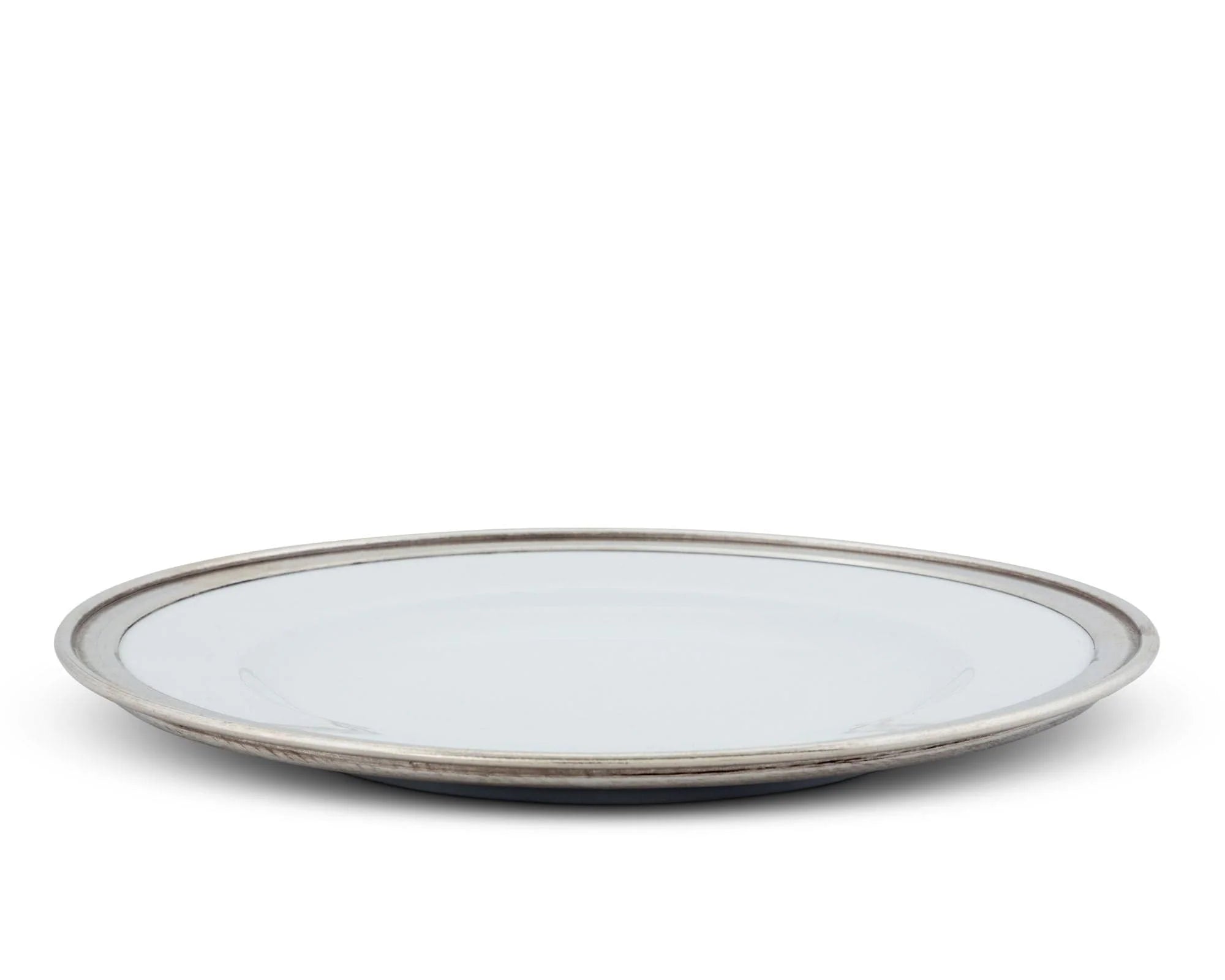 Elegant simplicity. Inspired by Mid-Century Modern design, Vagabond House's Tribeca Dinner Plate is crafted in fine porcelain and encircled with a highly polished pewter rim.