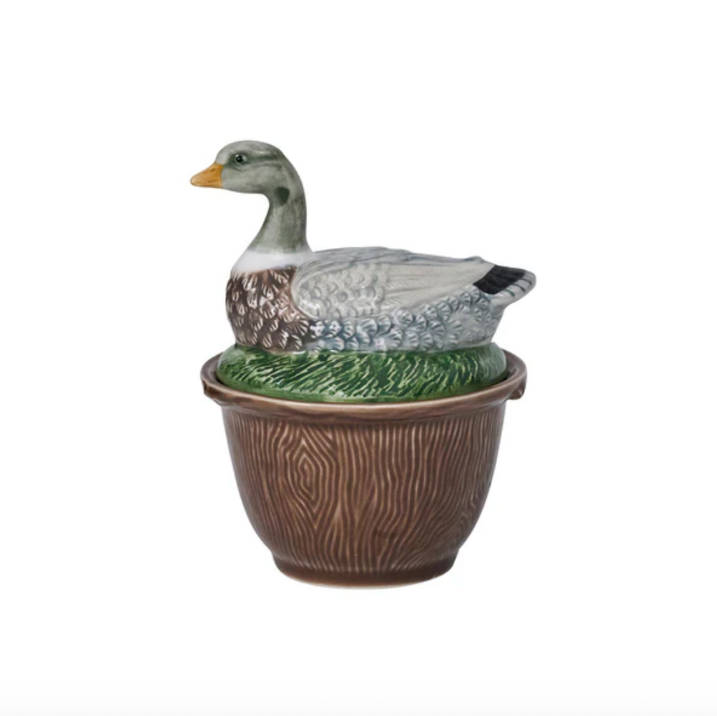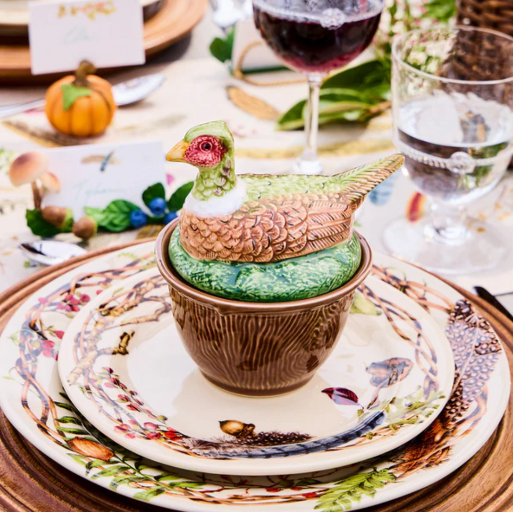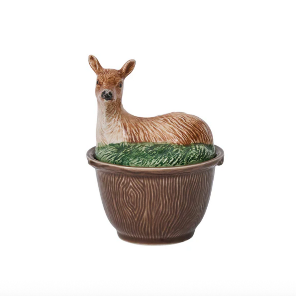 The irresistible fauna and fowl of the autumn woods capture the imagination and add enchantment to your fall tablescapes with beautifully sculpted likenesses hand-painted in Portugal, with intricate detail, atop ceramic bowls featuring a rich woodgrain motif. Rabbit, Pheasant, Deer and Duck are ideal for serving soups, desserts, or condiments—and are always ready to party. Stoneware base is food-safe and dishwasher, microwave, oven and freezer safe. Earthenware lid is handwash only.