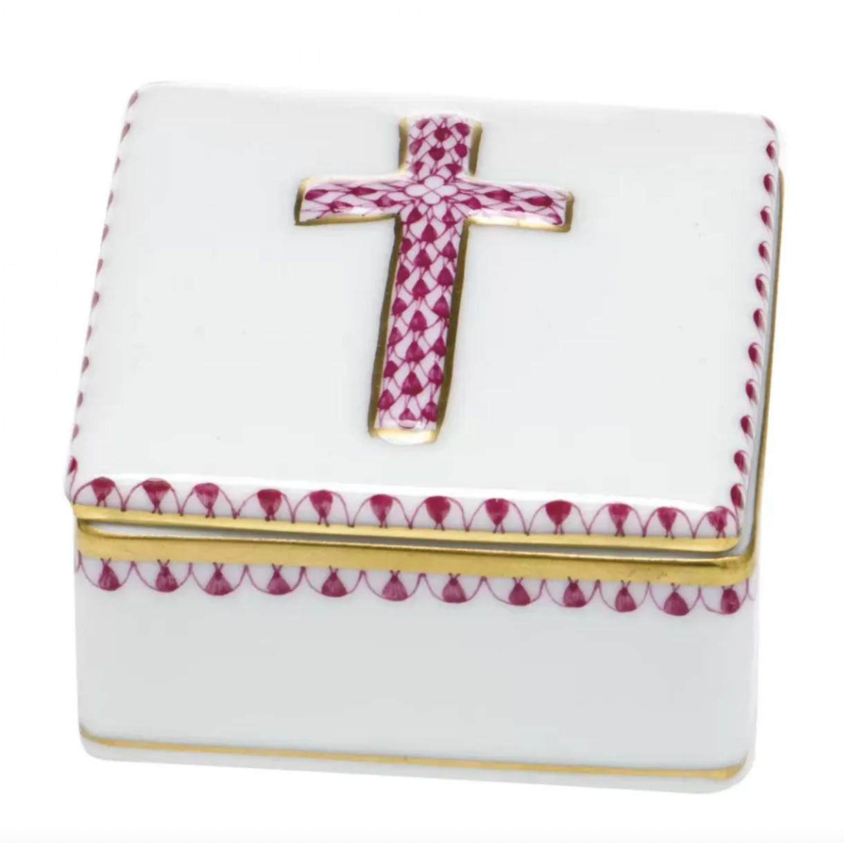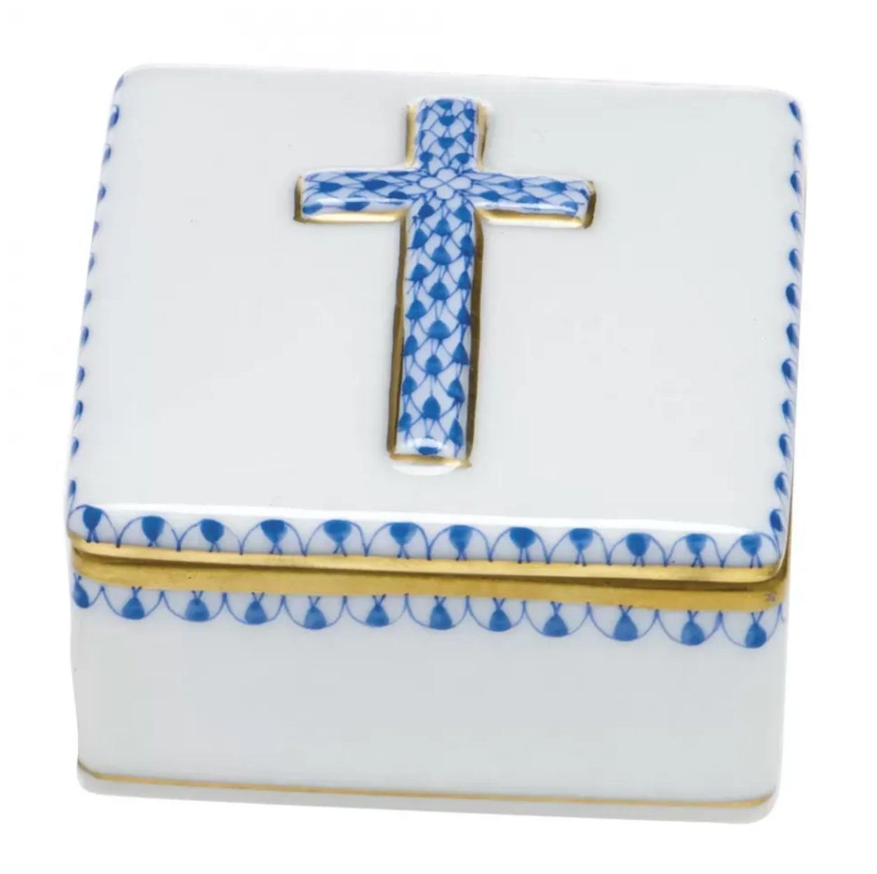 Herend porcelain prayer box with its trademark fishnet pattern design details and 24K gold accents. Each Herend piece is handmade and hand-painted in Hungary.