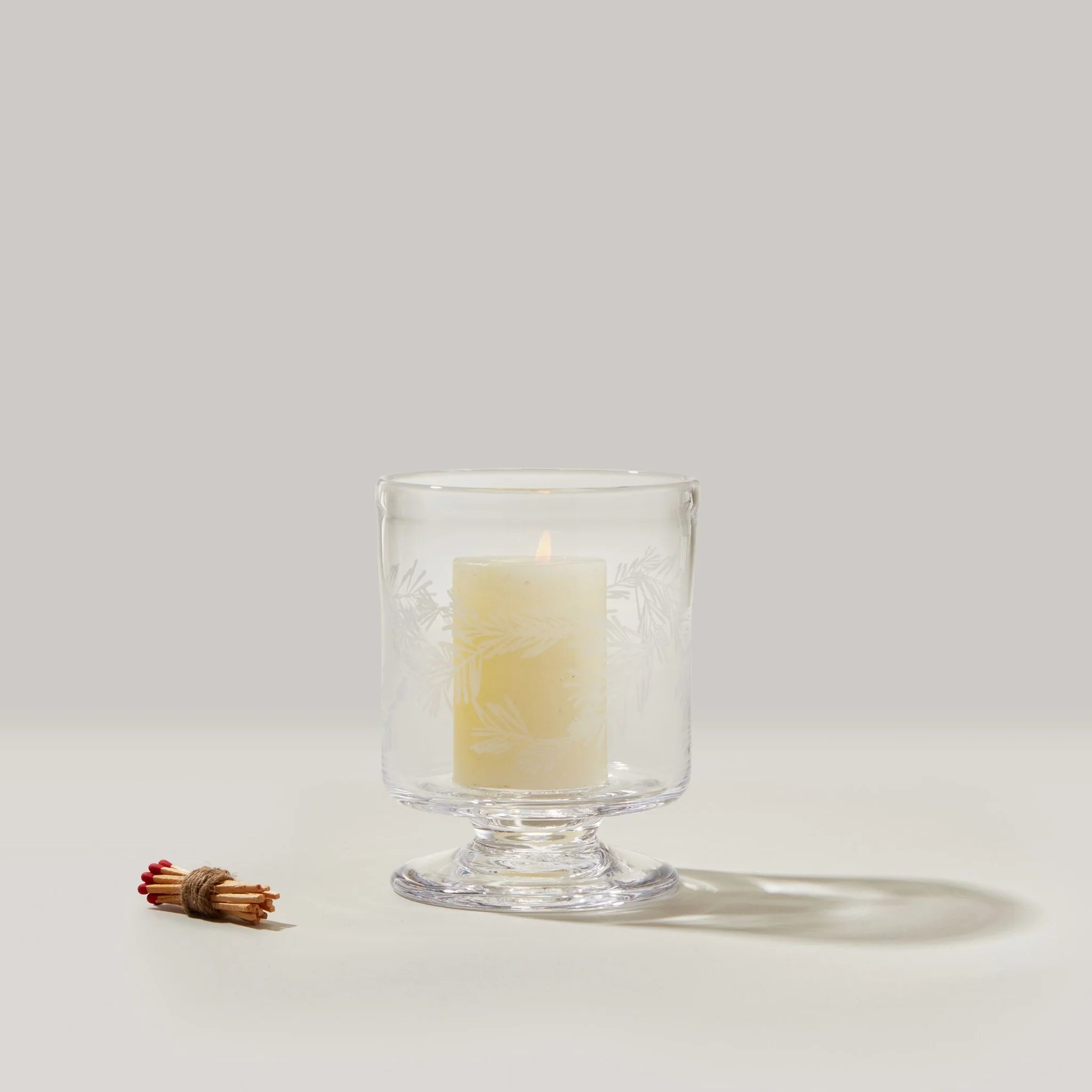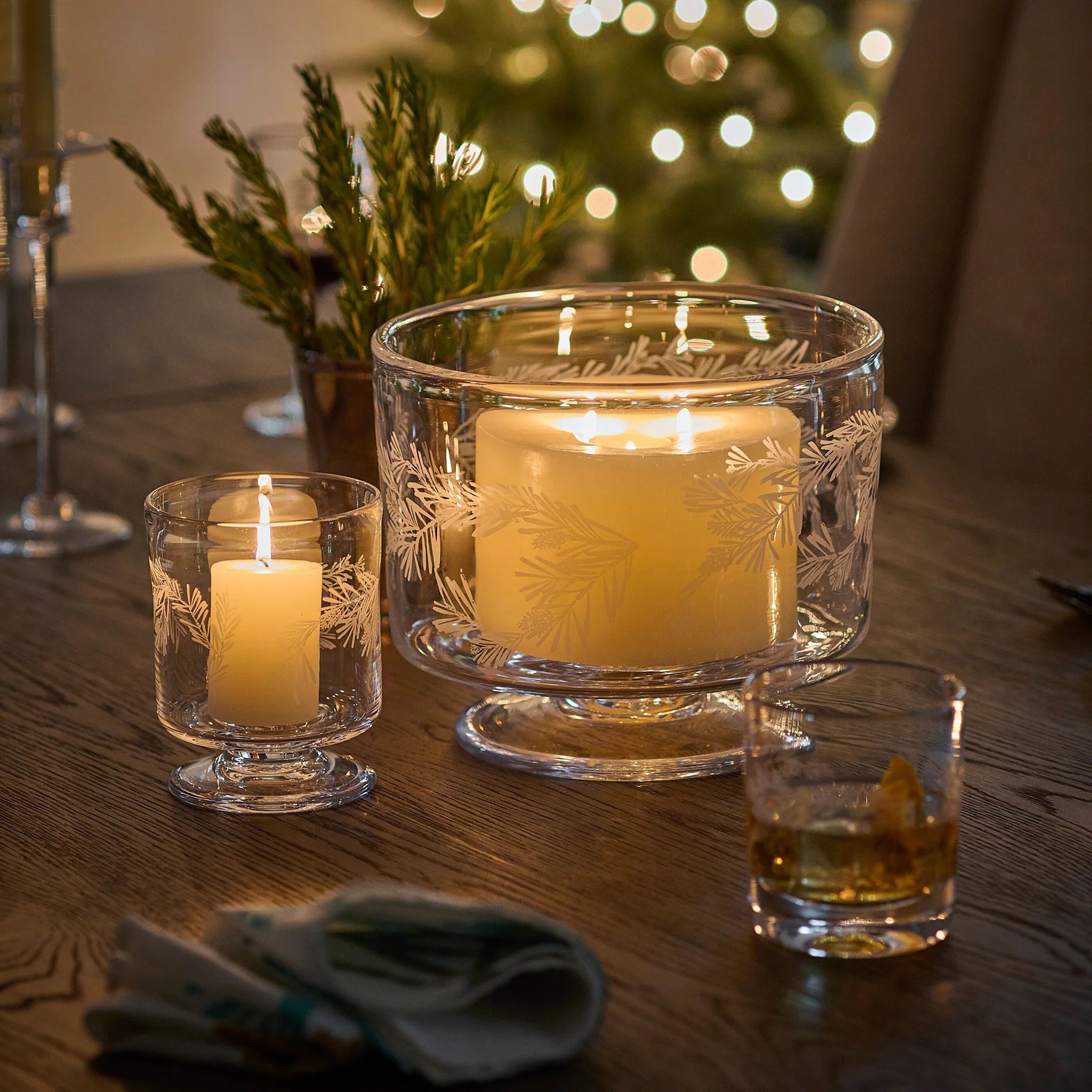 The clean, cylindrical silhouette of Simon Pearce's Nantucket Hurricane gets a seasonal update with a delicate pine engraving—bringing a classic winter motif to one of our most loved designs. Inspired by original sketches and engraved with fine detail, this piece casts a warm glow that highlights every branch and needle.