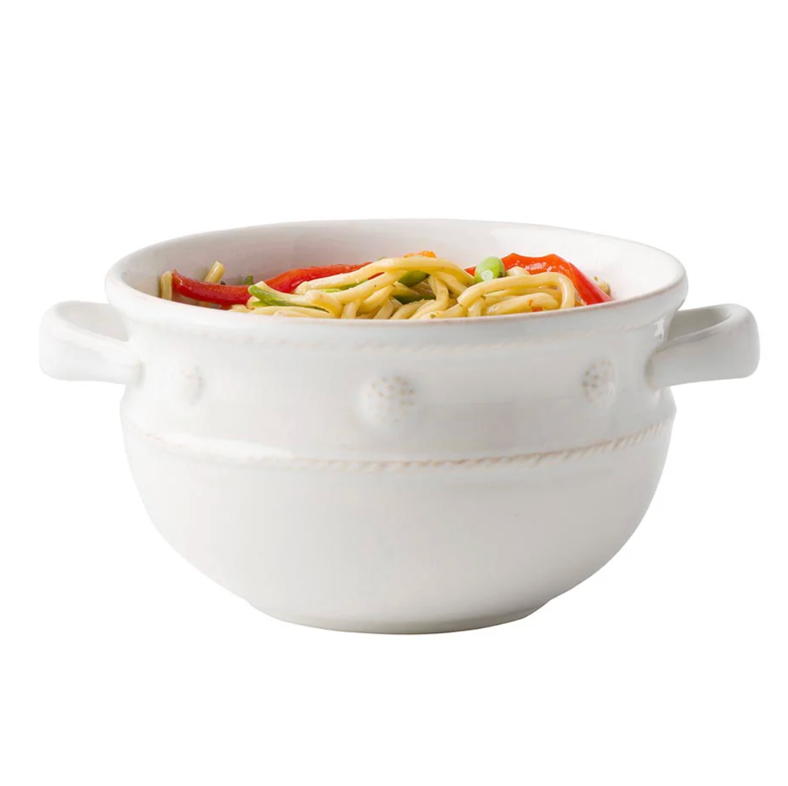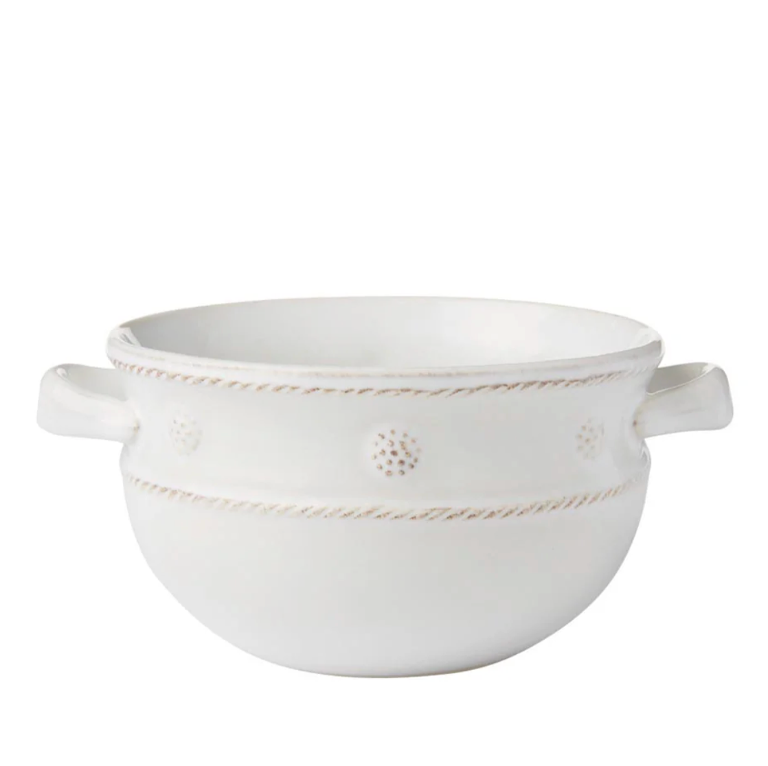 The pair of pretty handles on this bowl entices you to grab hold and eat heartily, from French onion soup a swirl with gruyere to your famous chili. Juliska's iconic Berry & Thread motif encircles the top rim. Ceramic made in Portugal. Dishwasher, freezer, microwave and oven safe.