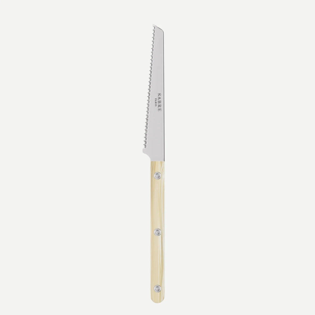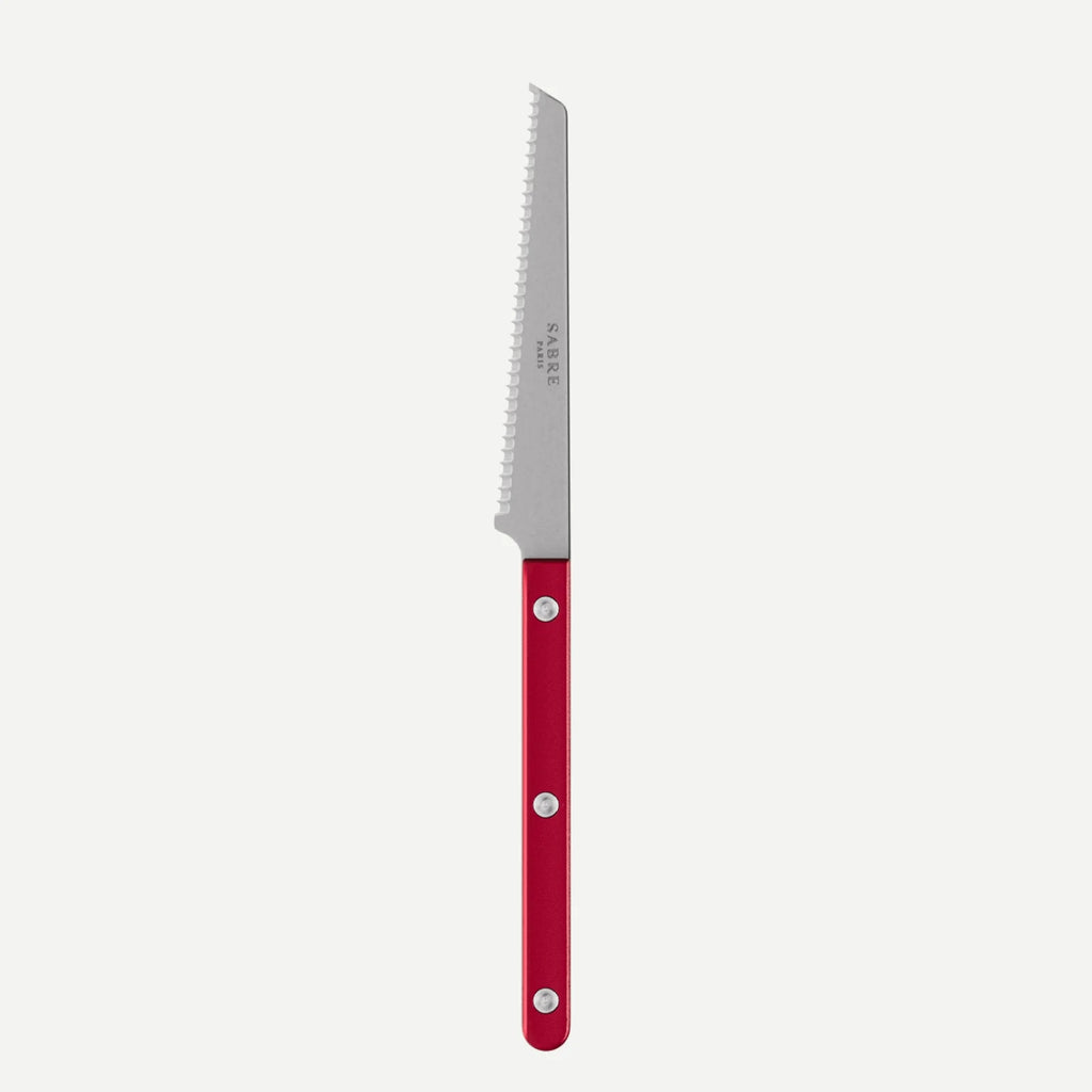 With the Bistrot collection, Sabre was inspired by some of their favorite places: restaurants, terraces and cafés. The styling is simple, the rivets are visible, while the colors and materials stand out nicely. Both traditional and contemporary at the same time. Thanks to its short, serrated blade, the Sabre tomato knife is the ideal accessory for cutting tomatoes without crushing them or for cutting bread baguettes. Stainless steel 18/10 - Acrylic handle.