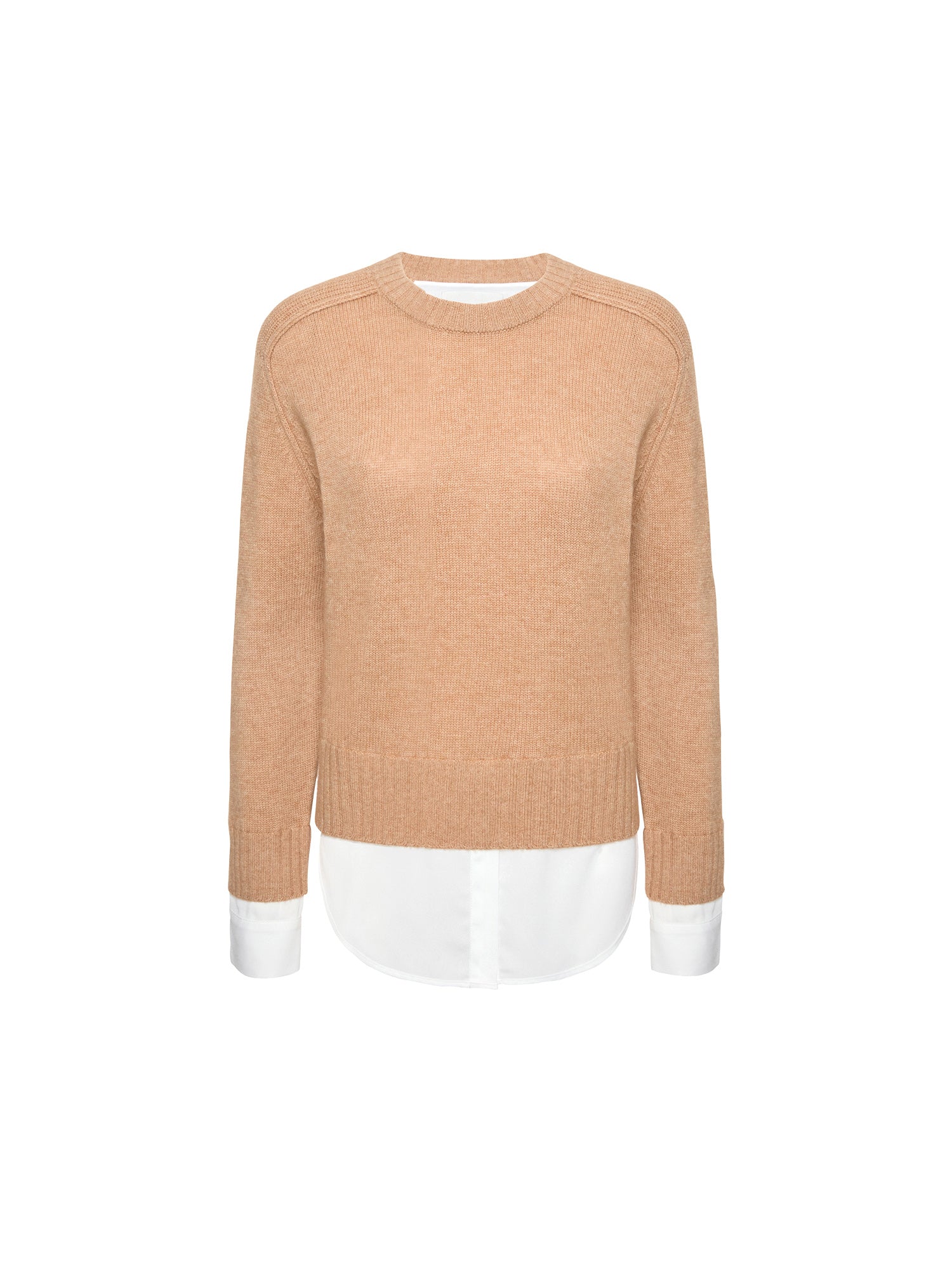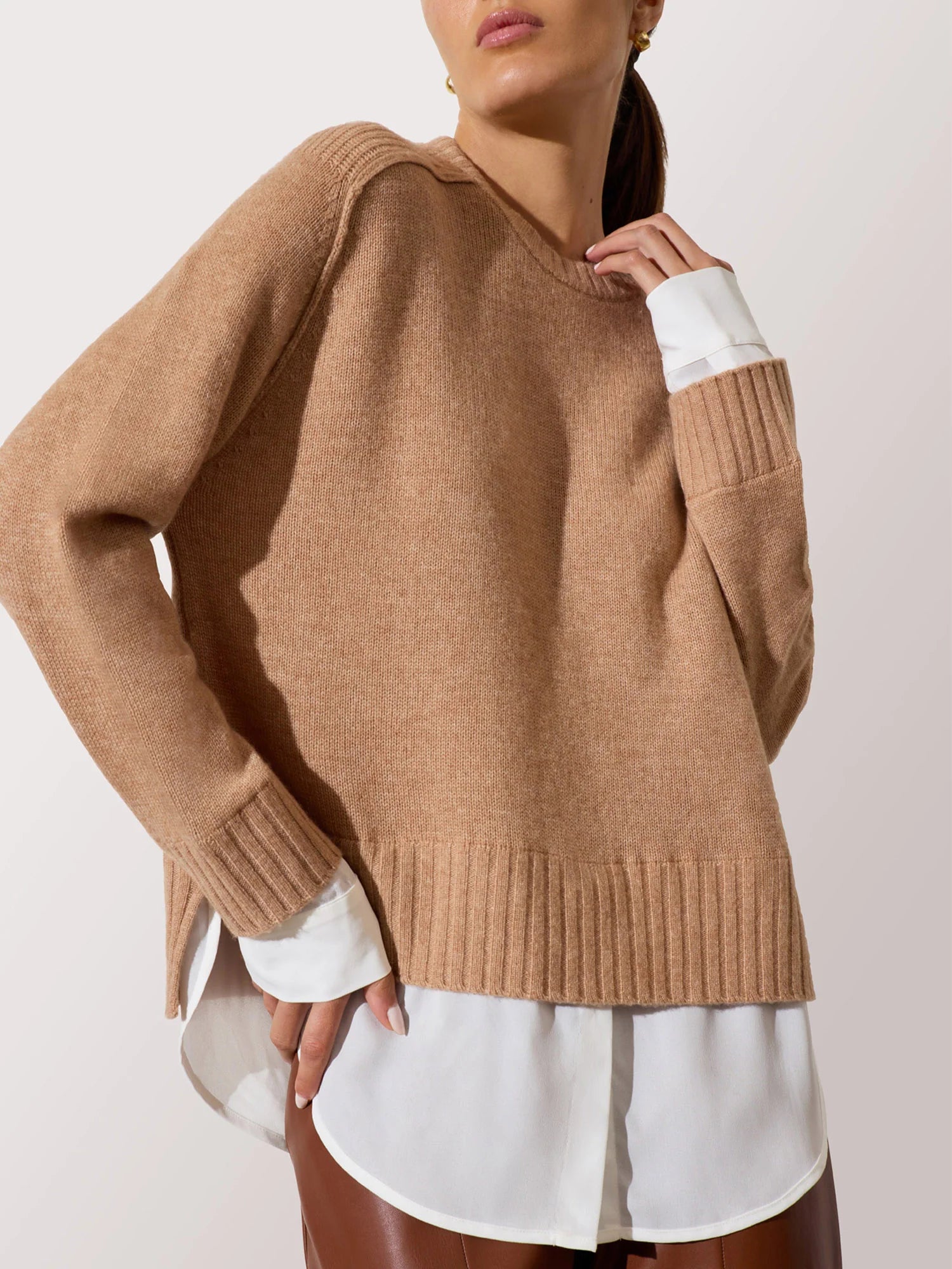Brochu Walekr took their forever best-selling signature V-Neck Looker and turned it into an everyday crewneck. Knit with the finest wool and cashmere blend yarn, this sweater is paired with a recycled georgette partial shirting underlayer giving the illusion of two pieces in one. Lightweight and always cozy, the Parson Crew Looker is the new Brochu Walker classic. 70% Wool/30% Cashmere with a partial recycled georgette underlayer.