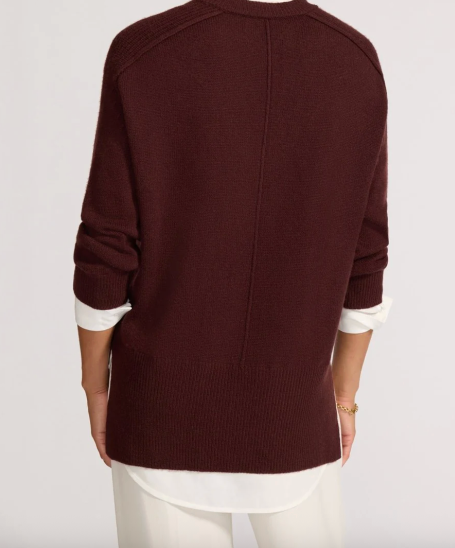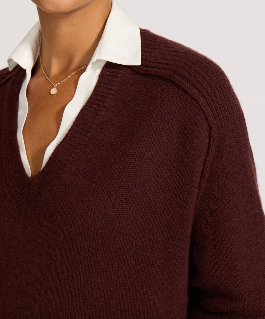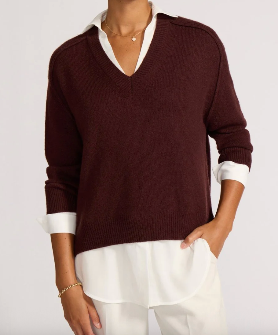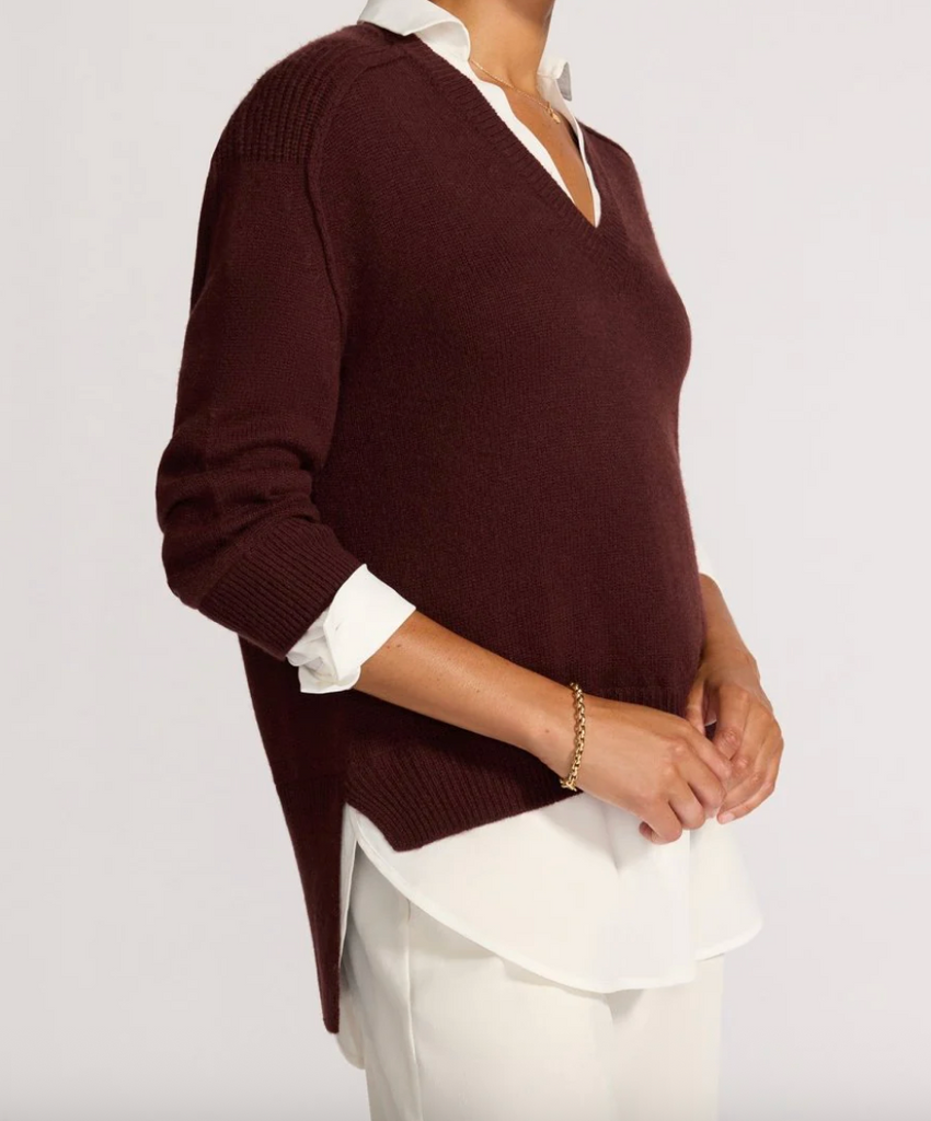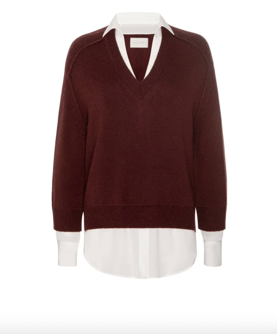 Brochu Walker's bestselling sweater for over 10 years, The Looker Layered V-Neck makes getting dressed and looking effortlessly chic so easy. A luxurious, cashmere blend sweater is pre-layered over a recycled georgette underlayer which creates the illusion of two pieces in one. The shirting collar, cuffs and hem are attached on the inside of the knit layer, so The Looker remains lightweight and trans seasonal, while the slightly oversized fit makes it cozy. 70% Wool/30% Cashmere with 100% Polyester Georgette partial shirting underlayer