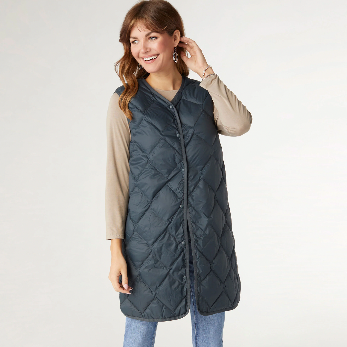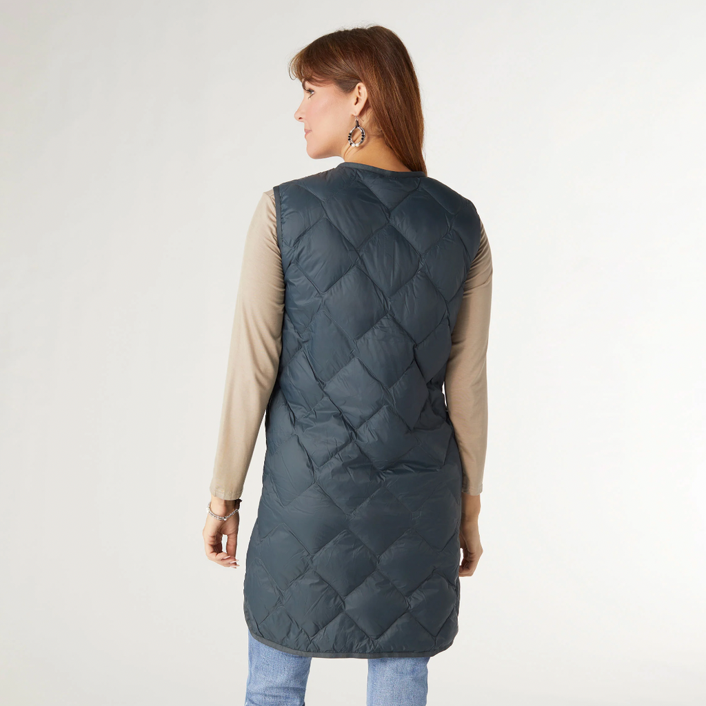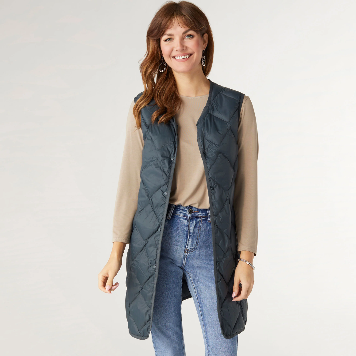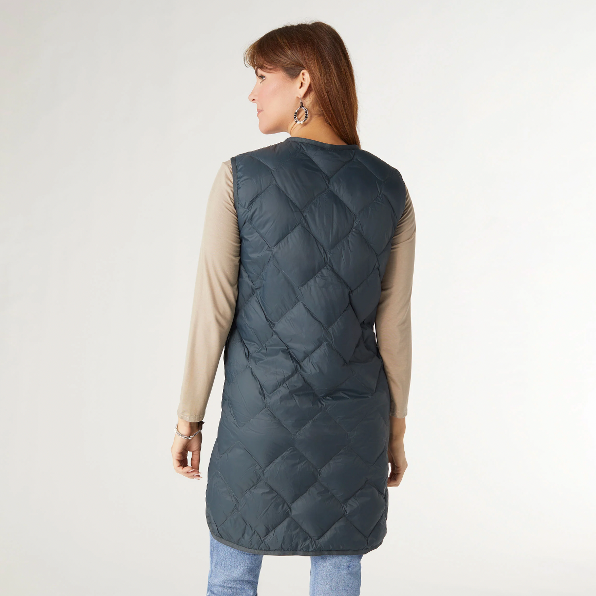 Lightweight, packable, real down. Made with real down feathers, the wander puffer vest is designed to keep you warm without creating bulk. Toss it on when another layer is needed, and when it's not, just roll it up and store it in the nylon drawstring bag. Features a long body, curved hem, side pockets, diamond quilting and button-snap closure. Materials: Nylon Filled with Duck Down.