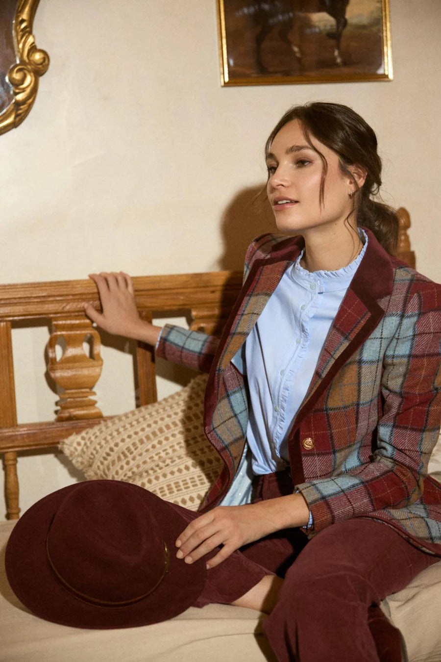 Classic cotton blouse from Tinta & Bariloche. Banded stand collar and button front. Small pleated ruffle at collar, front and cuffs. 97% cotton/3% elastene.