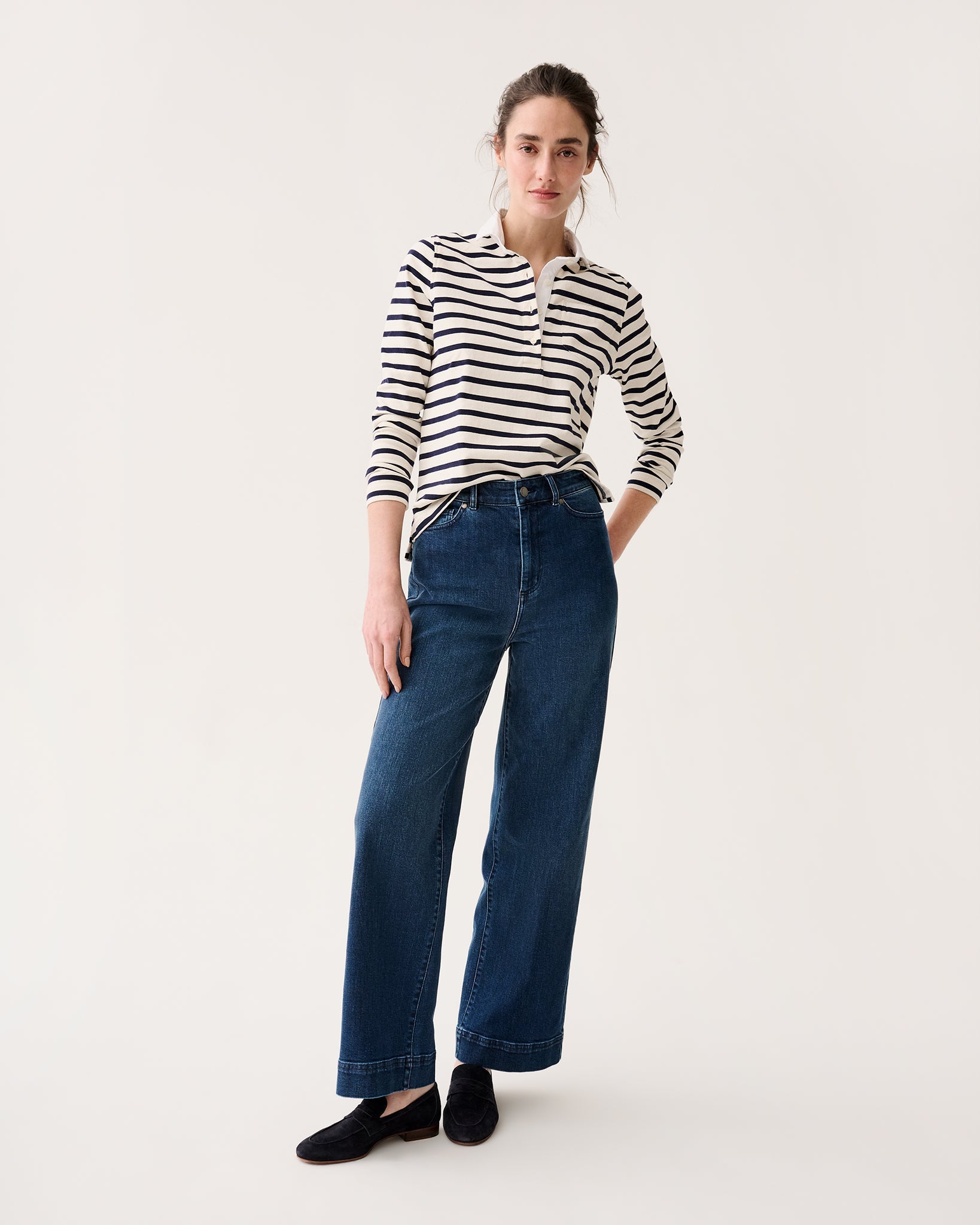 A breton? A polo? A sporty outer layer? Kind of all the above — which is what makes these so versatile. You'll especially love this Japanese heavy cotton: beefy and airy and cool to the touch. Tuck it into jeans now and tie it around your waist at the beach in a few months. Popover placket. 100% cotton.