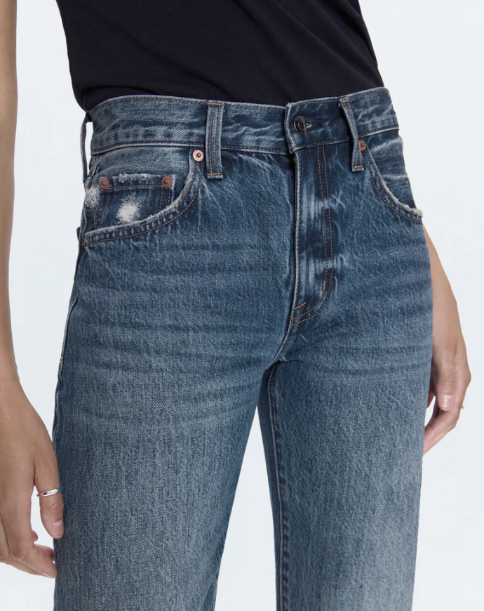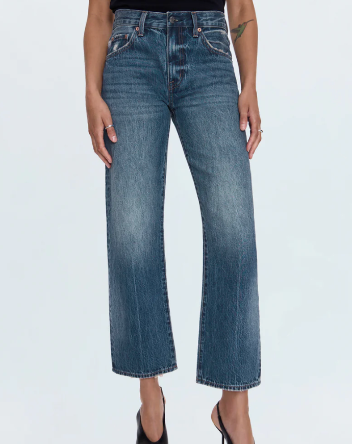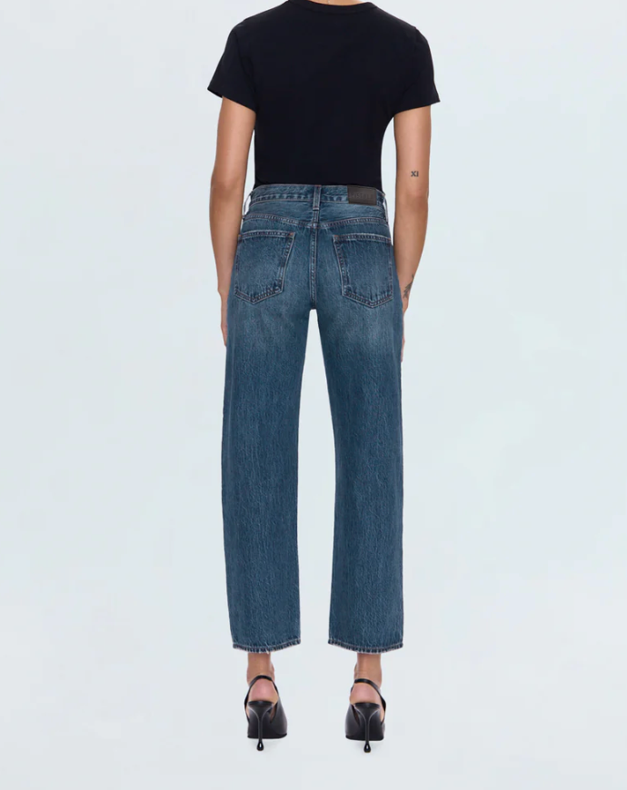 The best-selling jean that understands proportions. Lexi sits at the perfect mid-rise with a bowed straight leg, and a subtle curve at the knee that creates dimension without effort. Finished with a 29" inseam, the silhouette tapers to a cropped ankle with a clean hem. Crafted from rigid denim in Artisan, a rich dark wash with gentle fading around the knees and thighs.