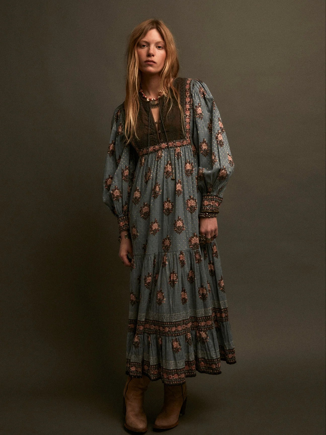 A darker yoke grounds the field of roses, anchoring the fall of fabric.