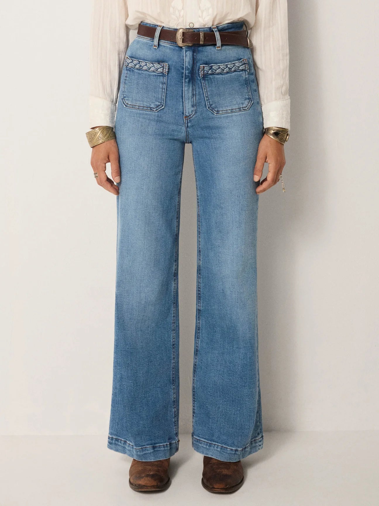Maison Hotel's Giuletta pant features a high-rise fit with a gentle flare for a flattering silhouette. Braided detailing at the pockets adds artisanal character. Versatile style for structured blouses or casual knits.