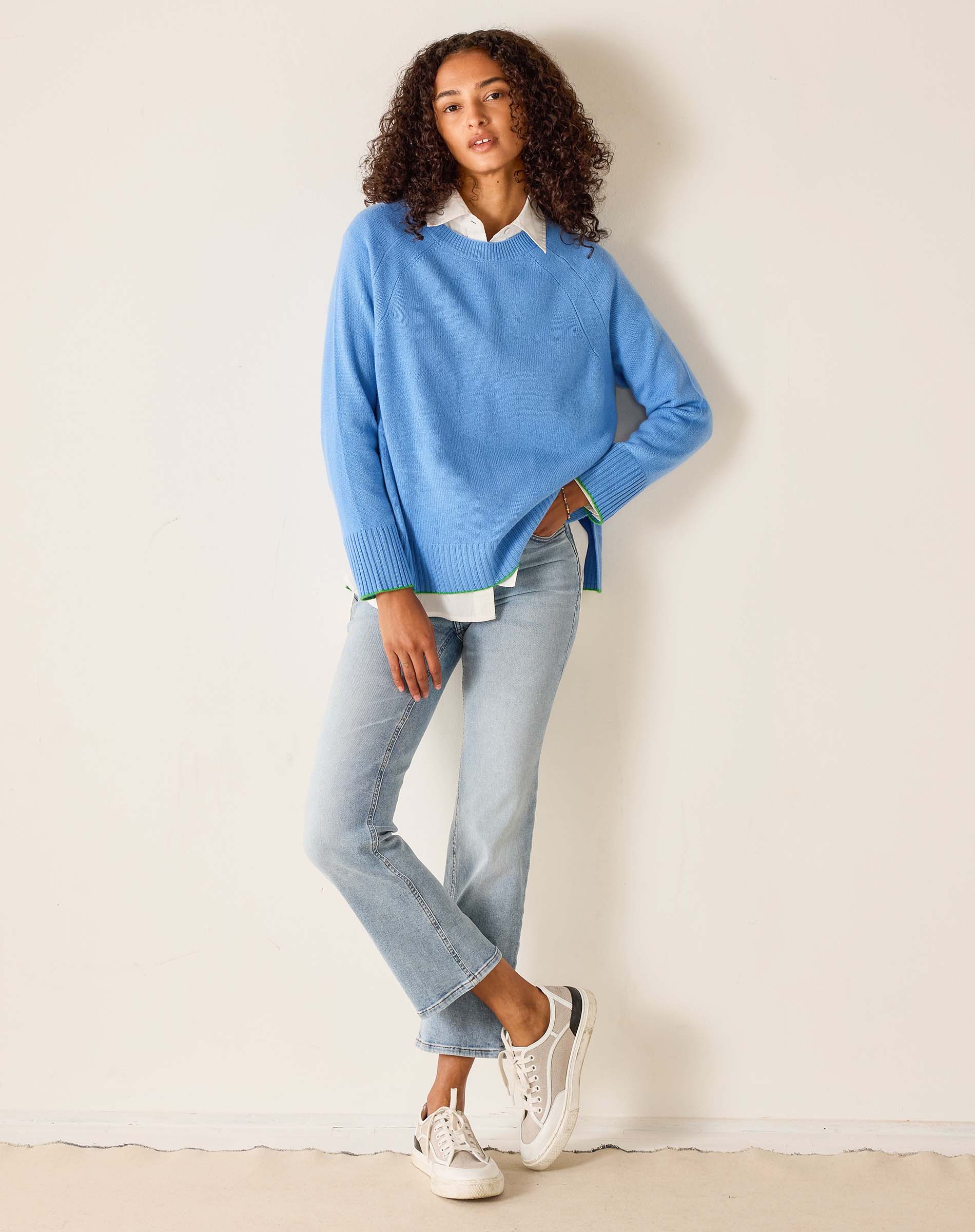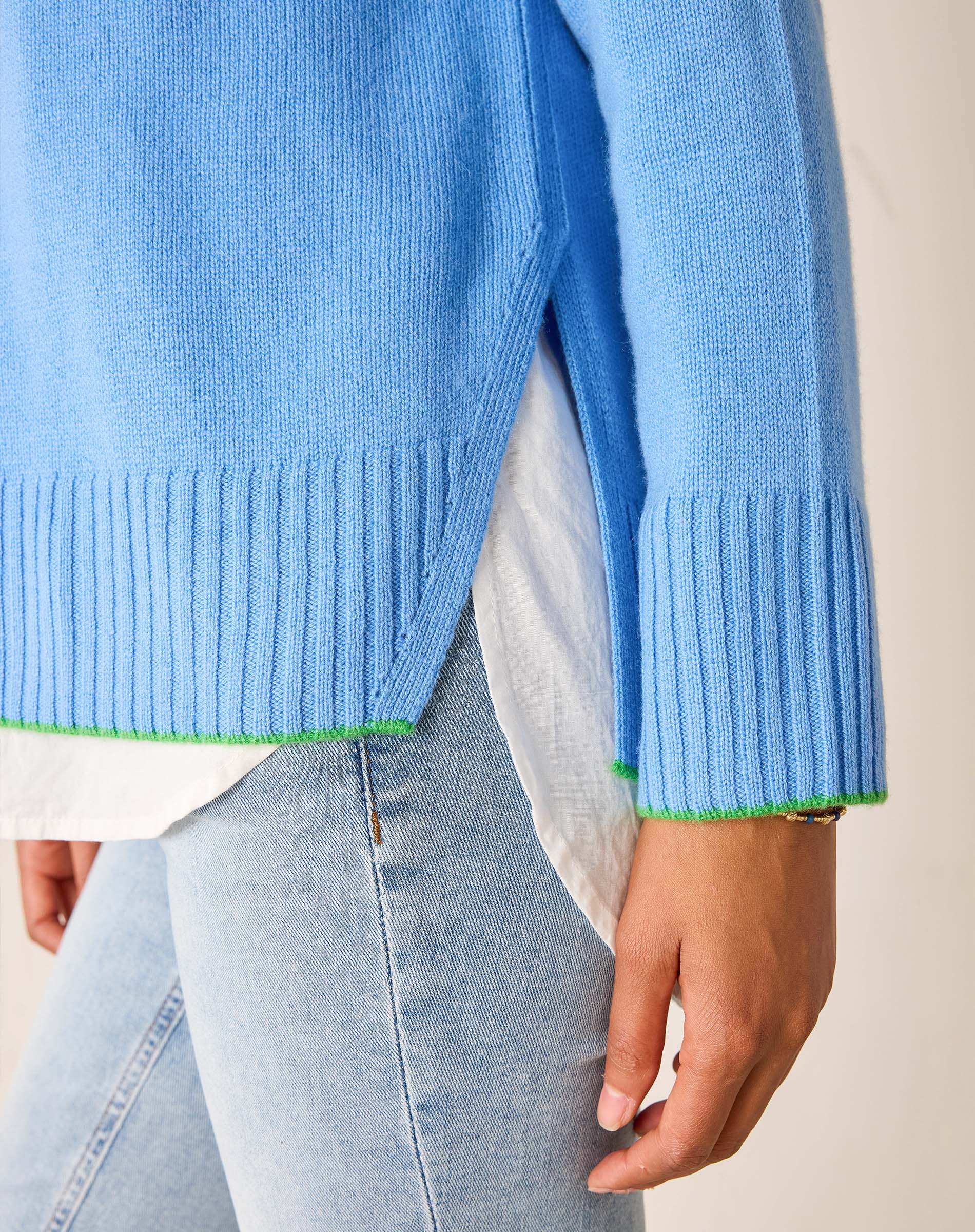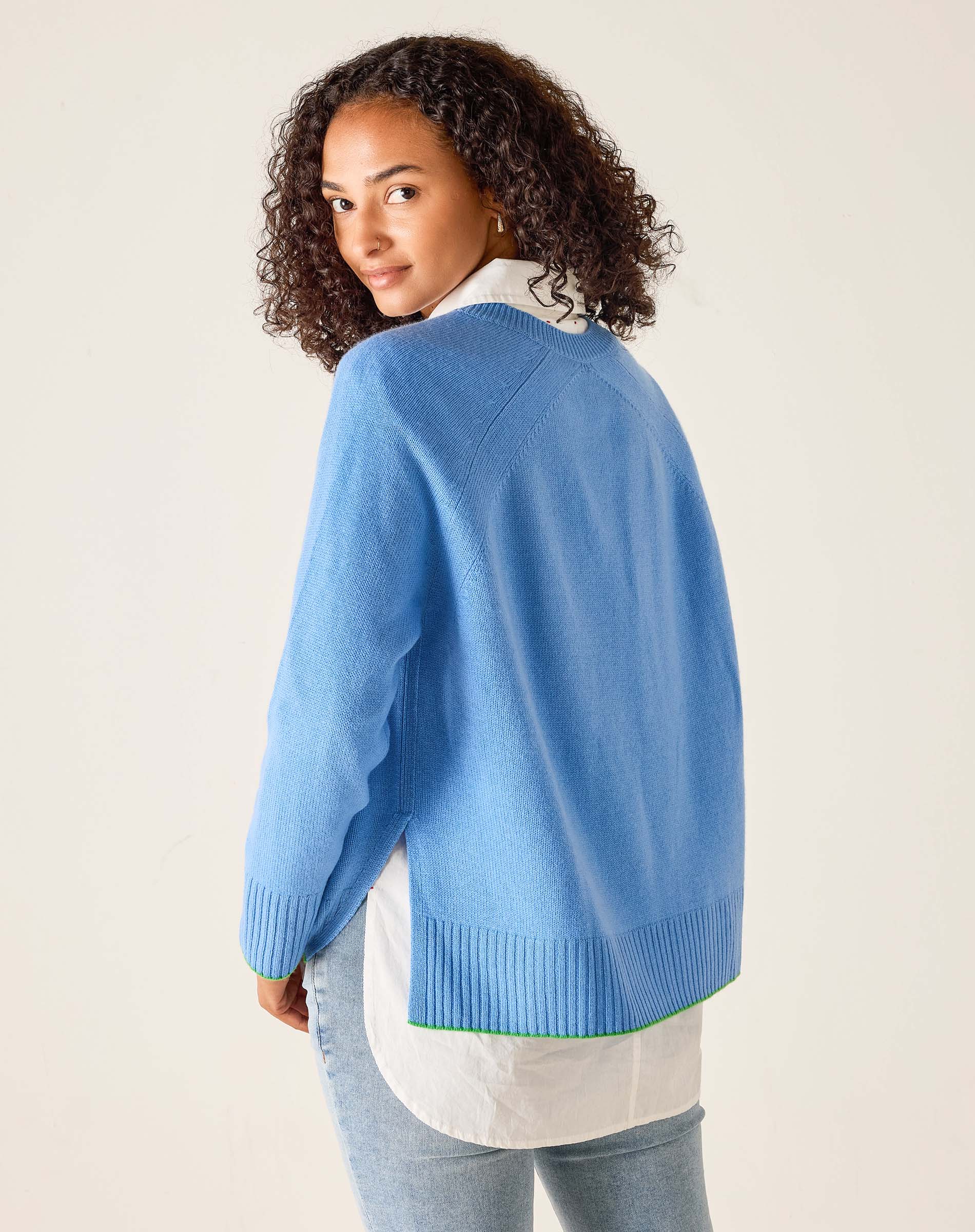 Mersea's Banff Crewneck Sweater has a short side slit for mobility and style with ribbed cuffs and collar. Layer it with a collared shirt or pair it with your favorite slacks, you'll never get tired of this cool weather sweater. French blue with contrasting kelly green trim at wrists and hem.