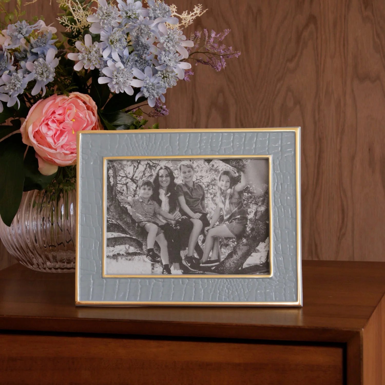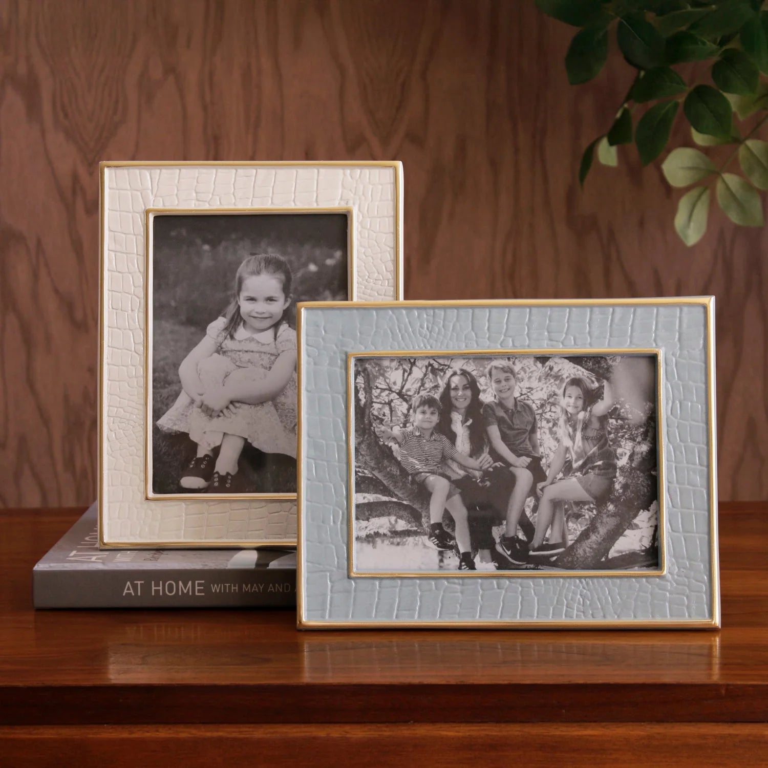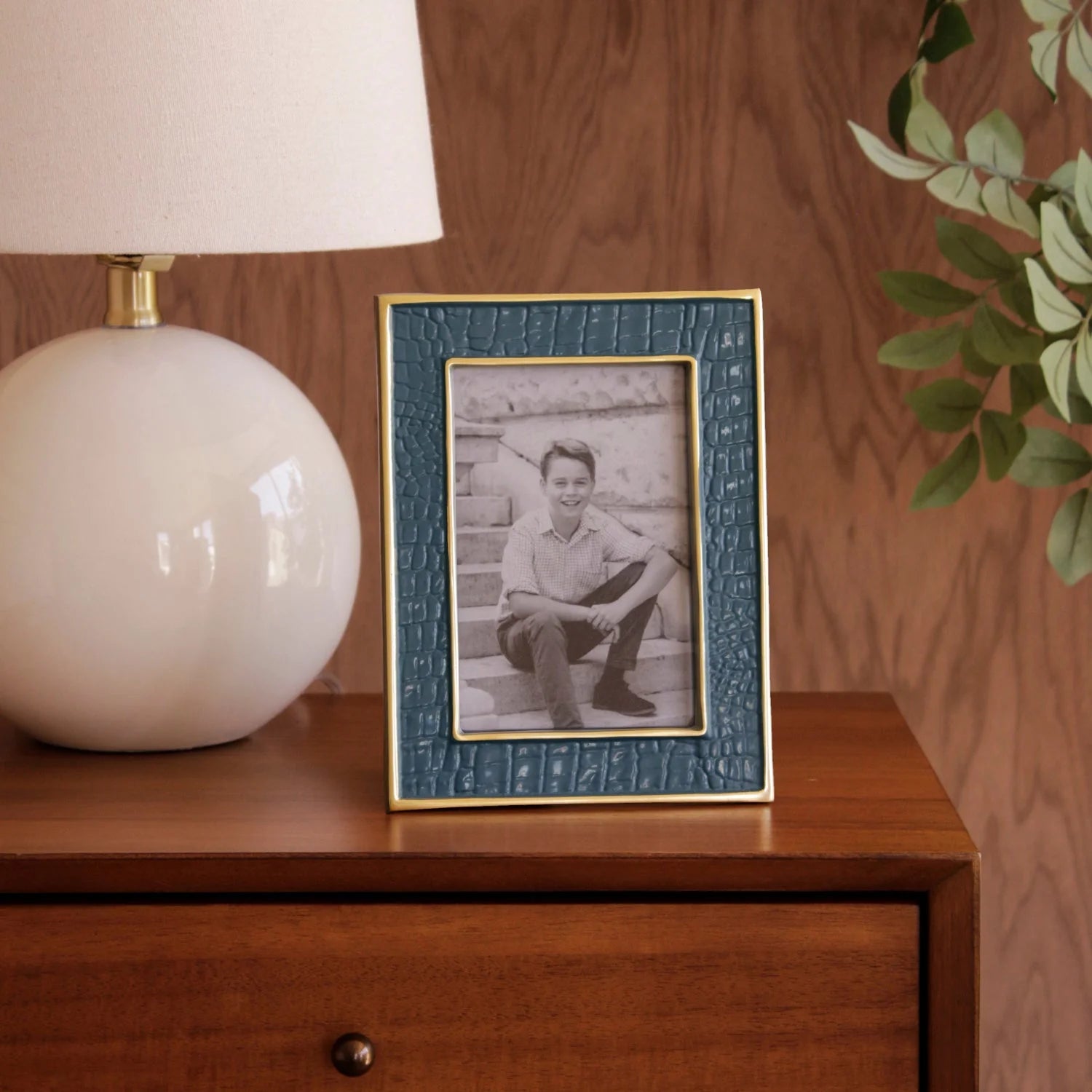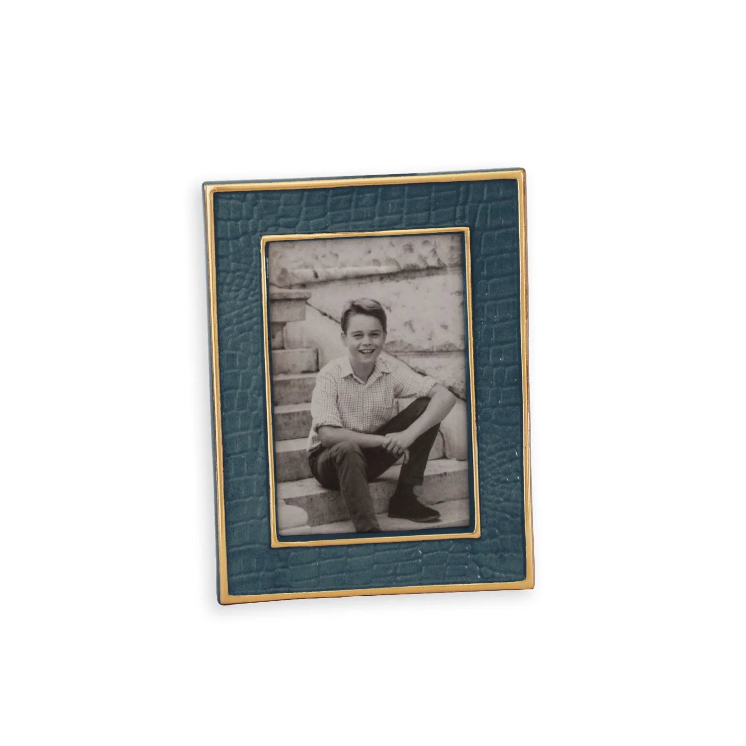 Bold texture meets modern elegance. The Encanto Croc Frame features a richly colored enamel finish with a distinctive crocodile pattern, framed in gold for a striking presentation of your favorite photo. Designed for vertical or horizontal display.