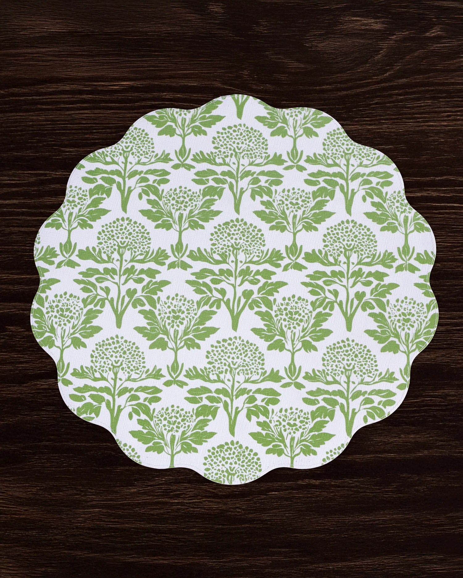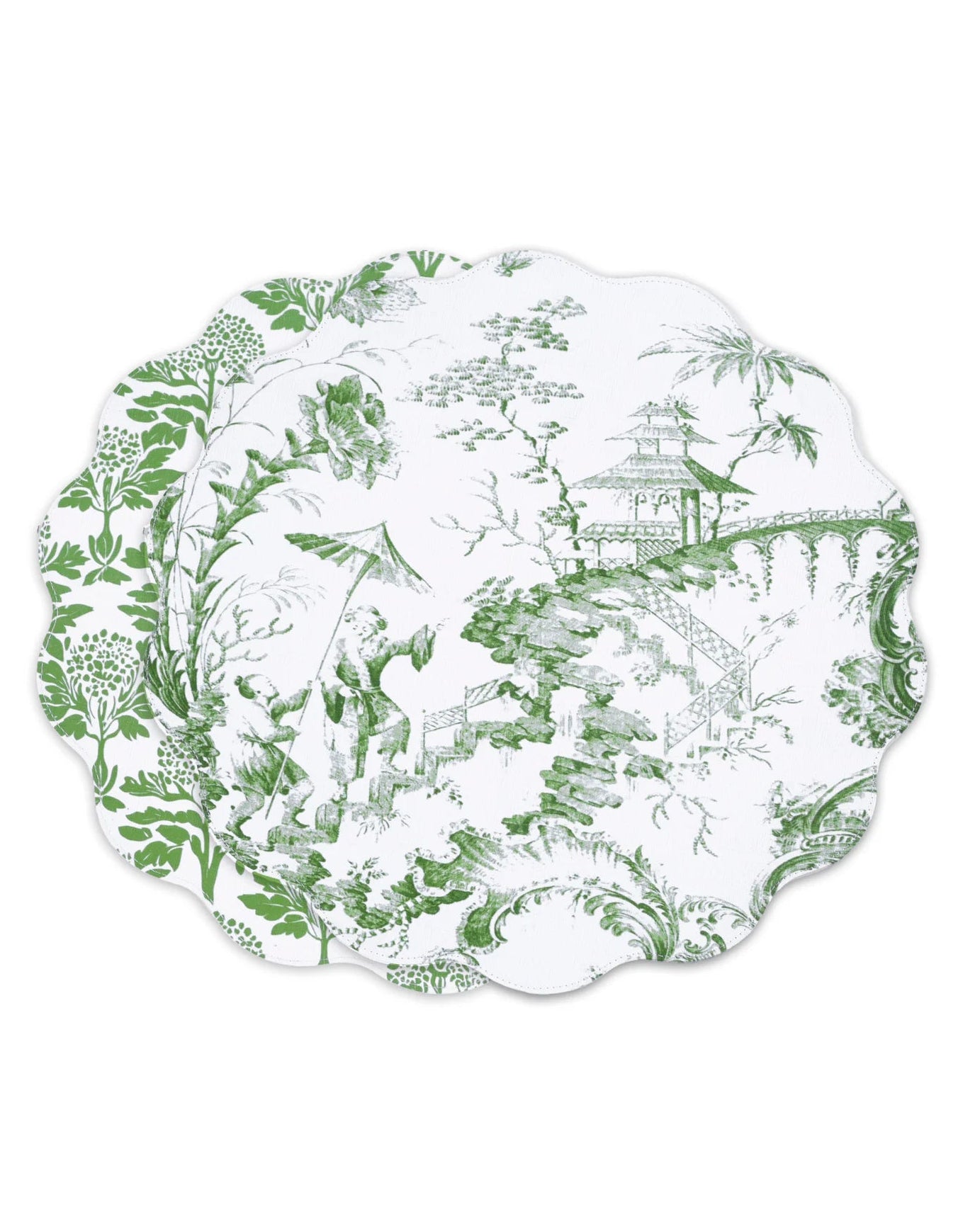 Two looks in one timeless design. The VIDA Reversible Round Placemats  have a supple leather-like feel and linen texture. One side features a classic Chinoiserie motif with Asian figures, foliage, and a pagoda; the reverse shows a stylized floral pattern.