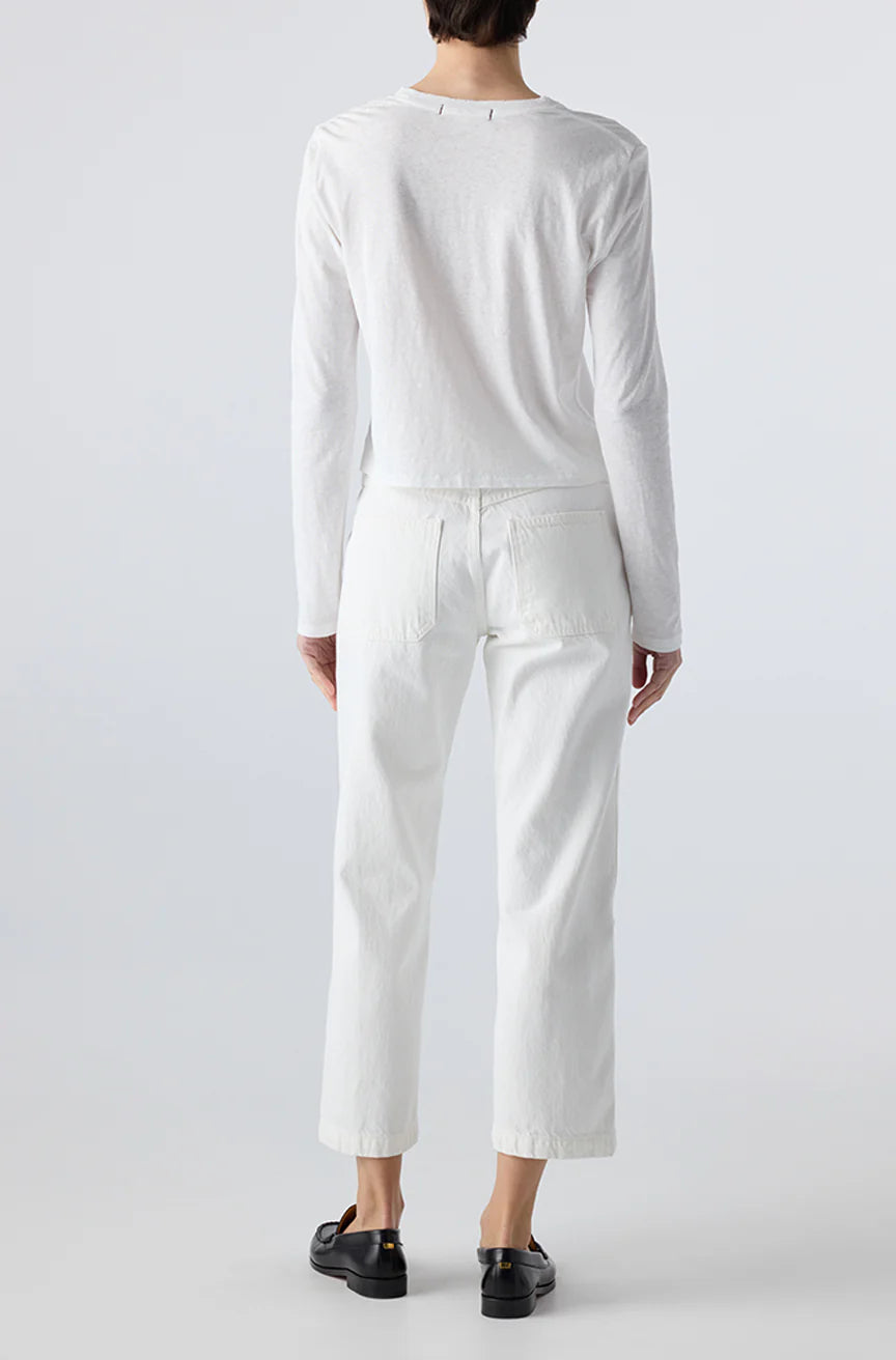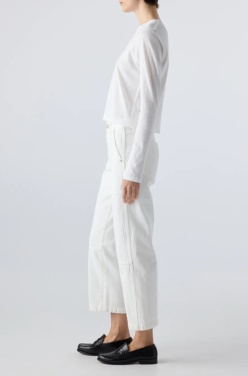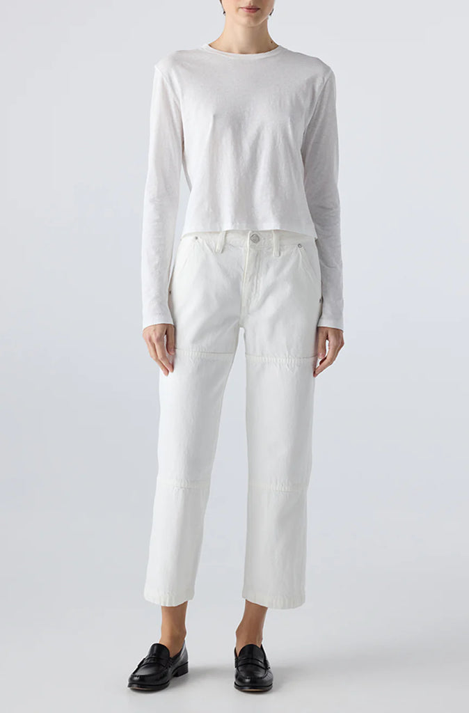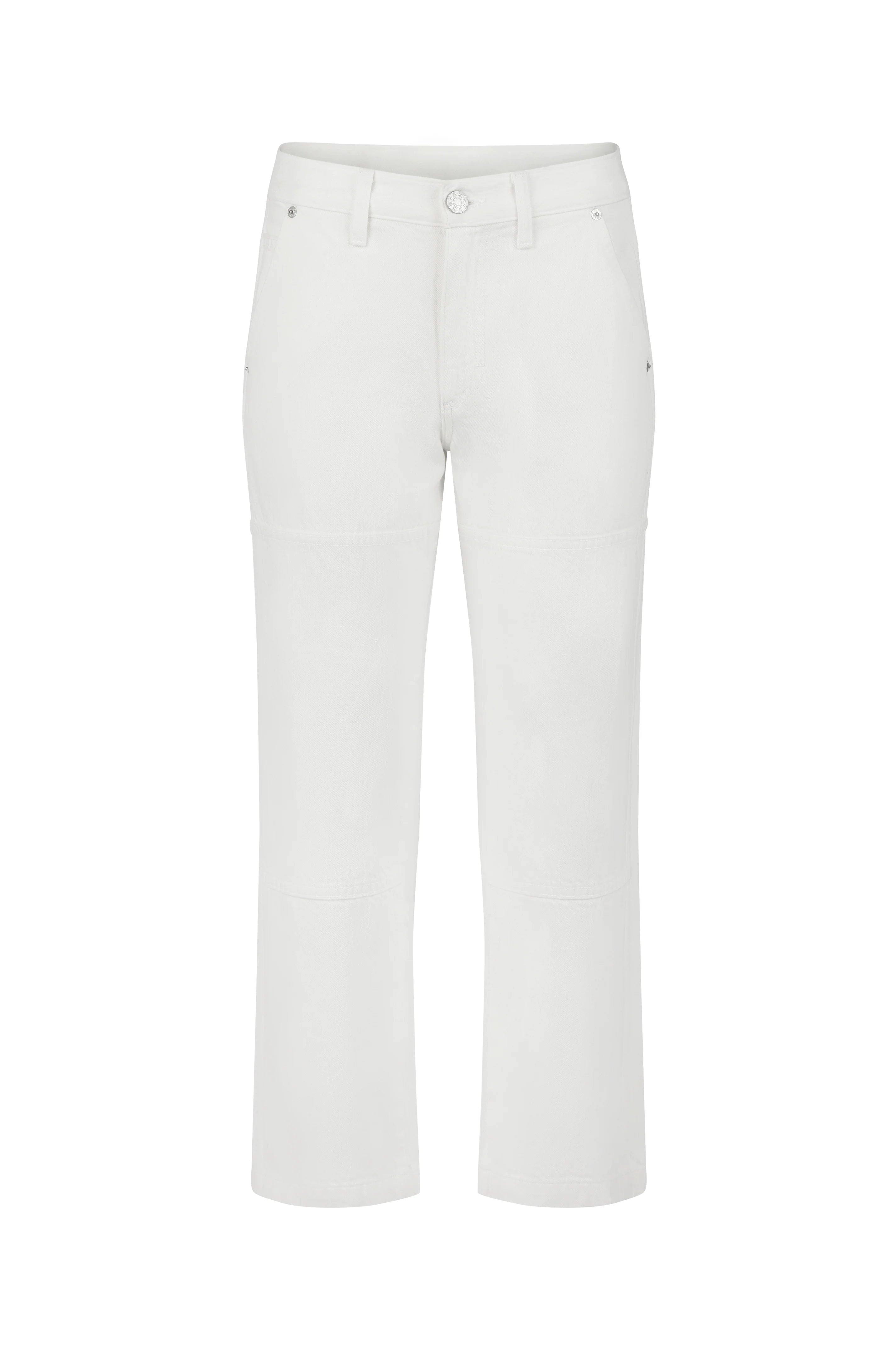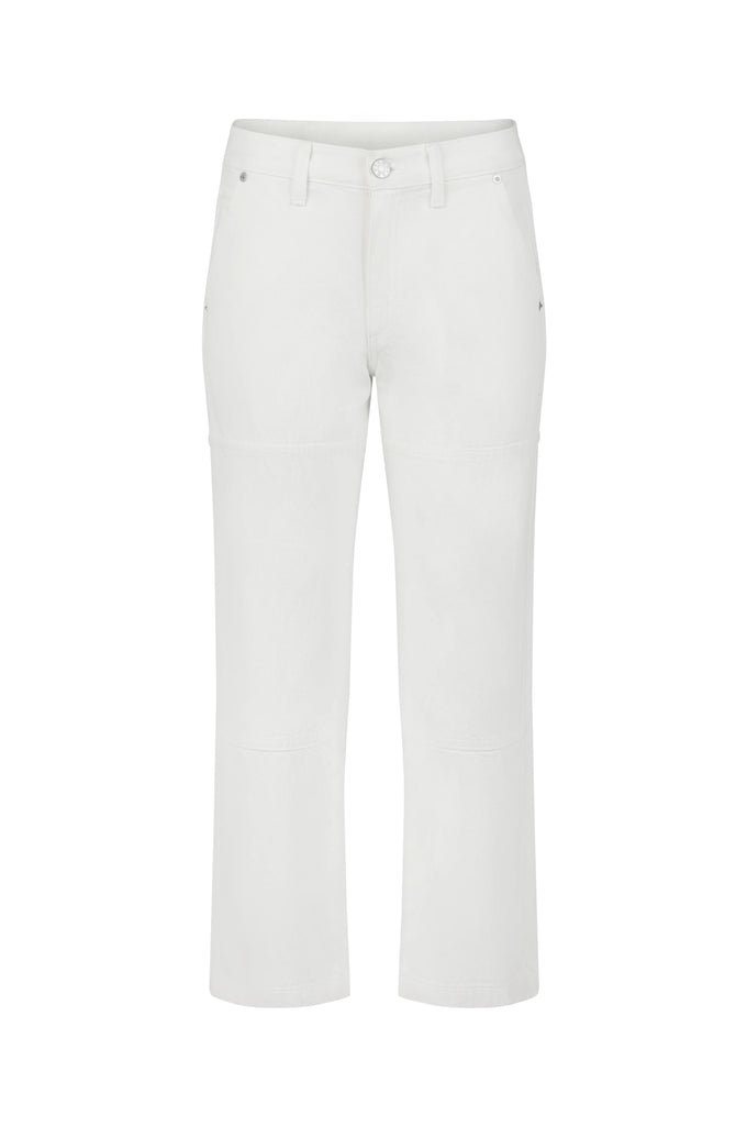 AMO gave their best selling Billie a utilitarian vibe by adding quarter top pockets and double knee pads. The cropped, wide straight leg makes for an easy and popular fit. With a mid rise, this pair is designed to sit low on the hips for a relaxed look. Zip fly. 100% cotton.