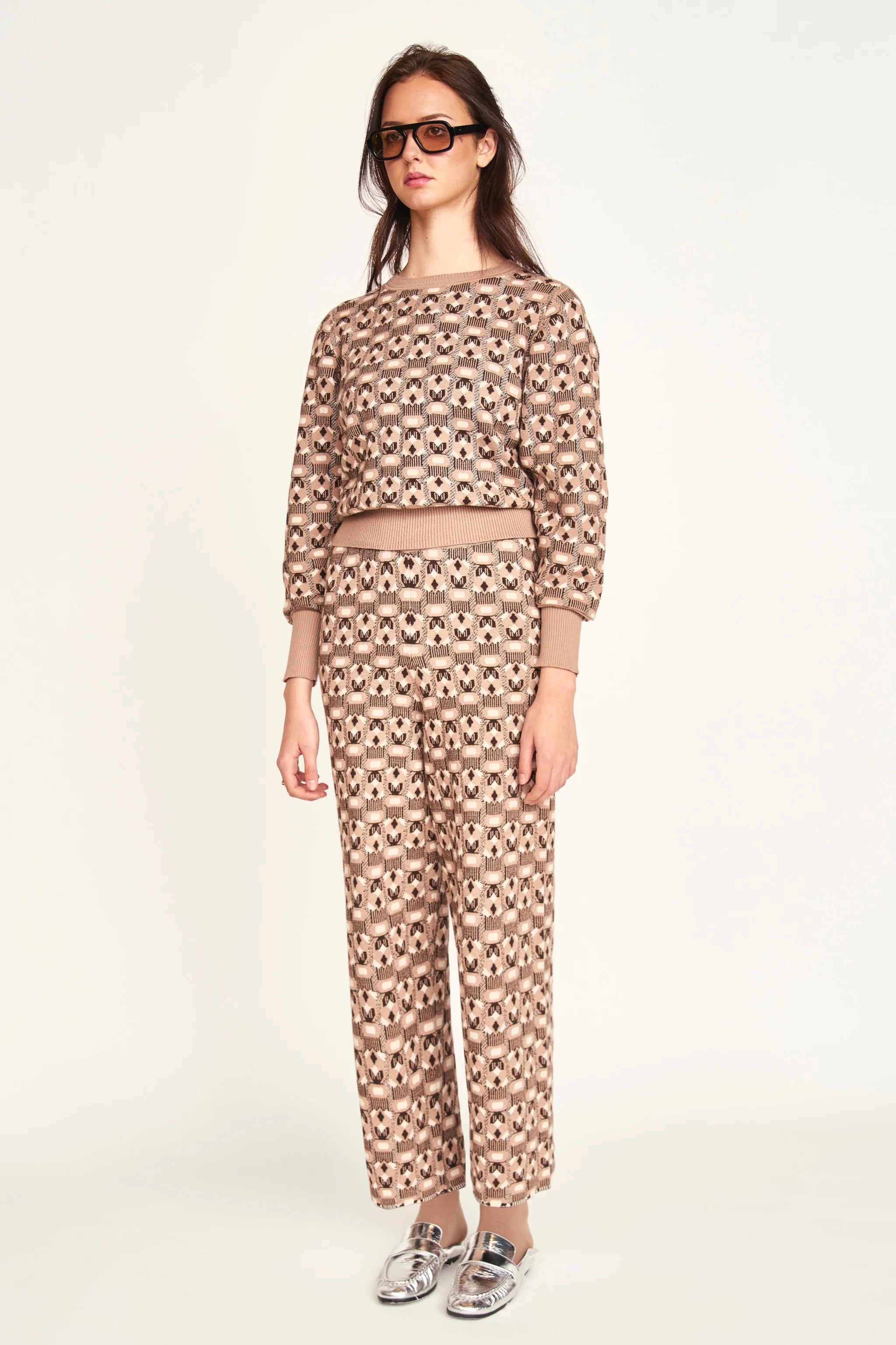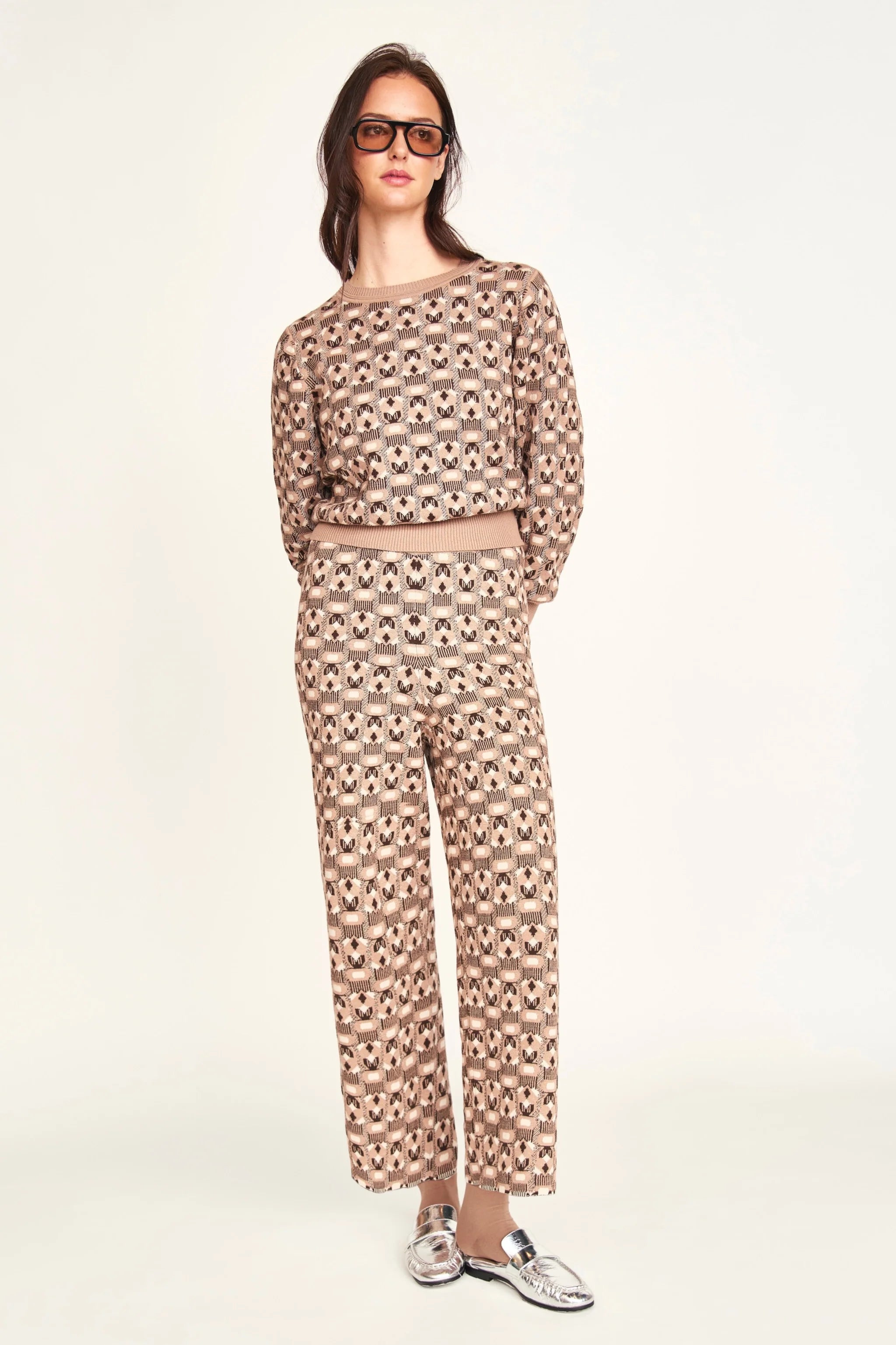 Jacquard knit pant with subtle hearts in the pattern. Covered elastic waistband. Straight leg. 100% Pima cotton.