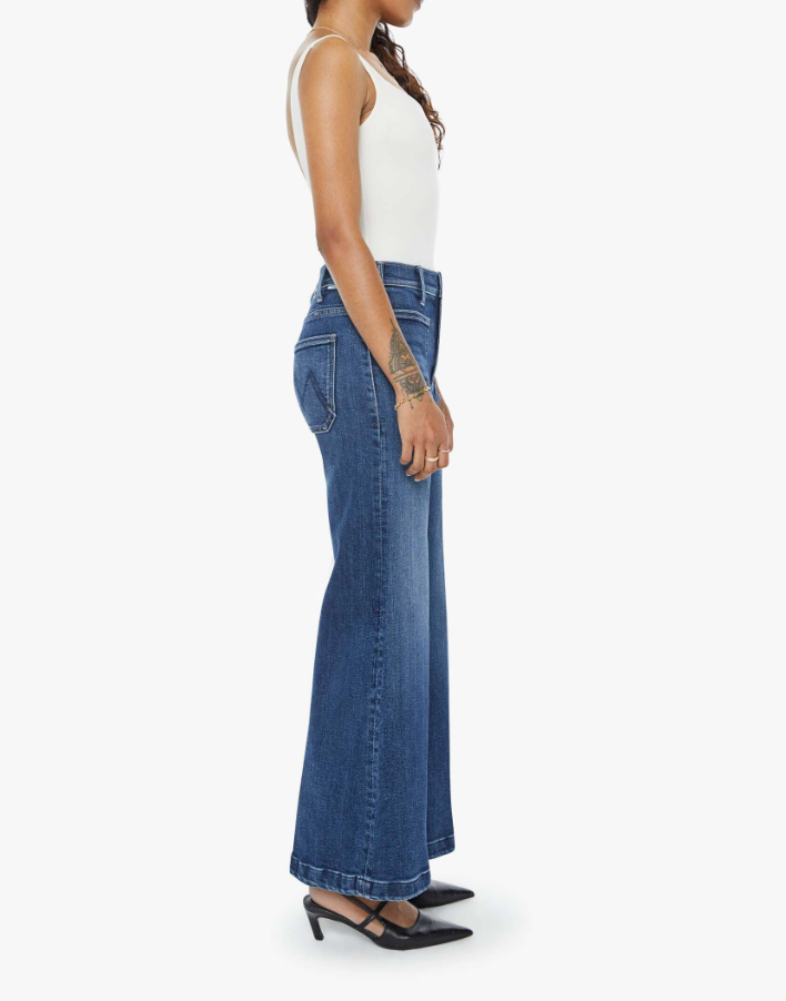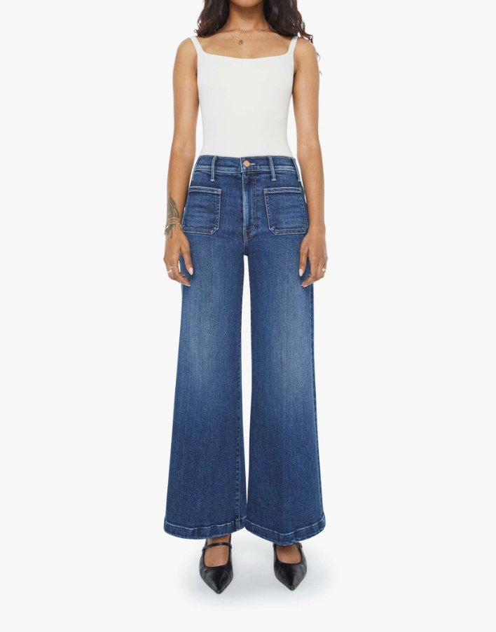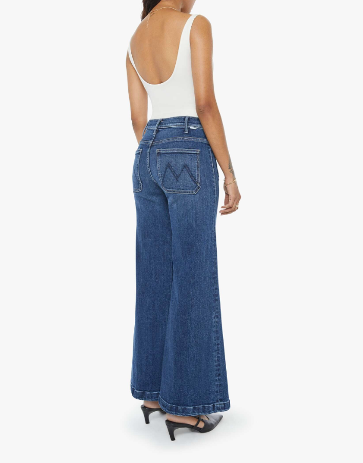 70s-inspired wide leg jeans with a high rise, zip fly, patch pockets, 28-inch inseam and a clean hem. Made from stretch denim, One Last Shot is a dark blue with subtle whiskering and fading at the knees. 78% Cotton 16% Modal 4% Polyester 2% Elastane.