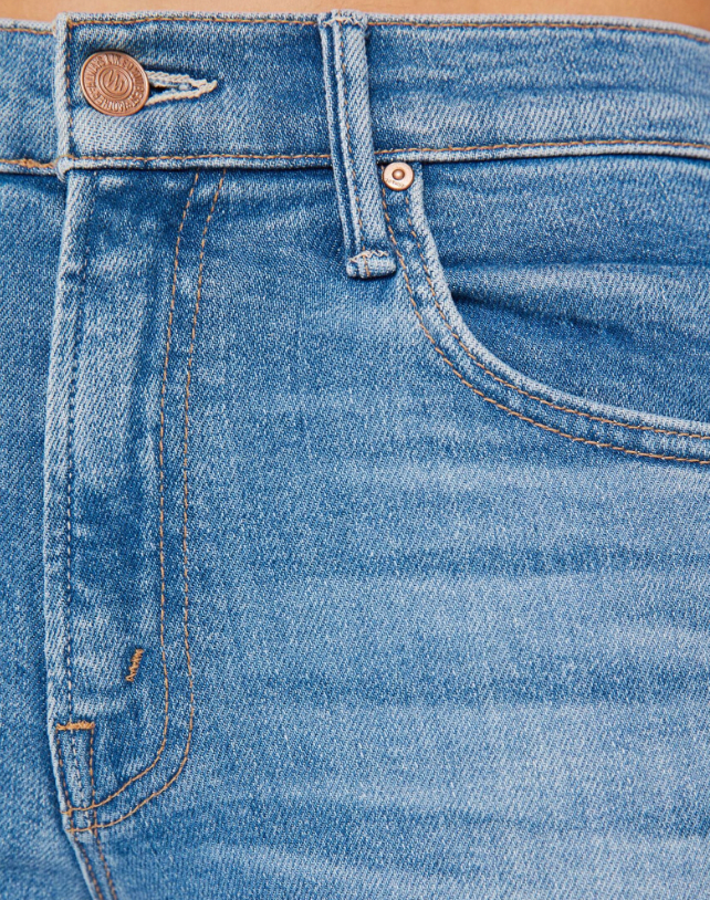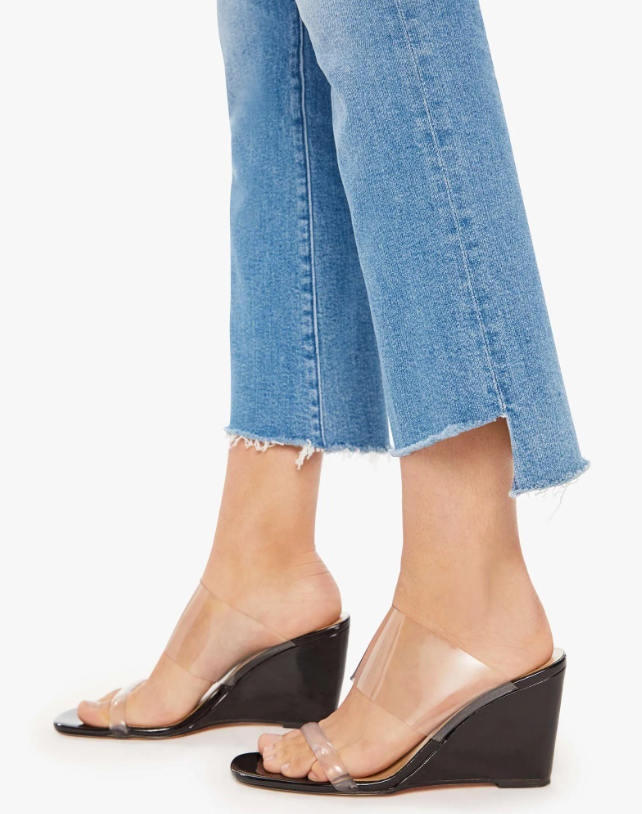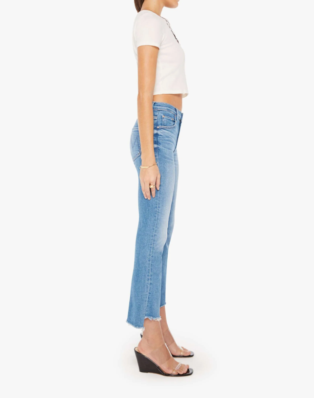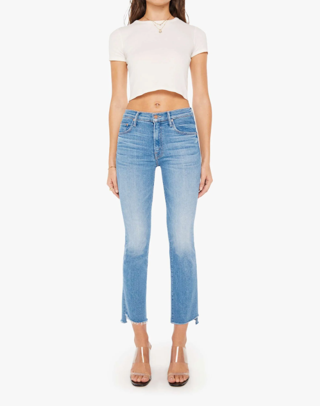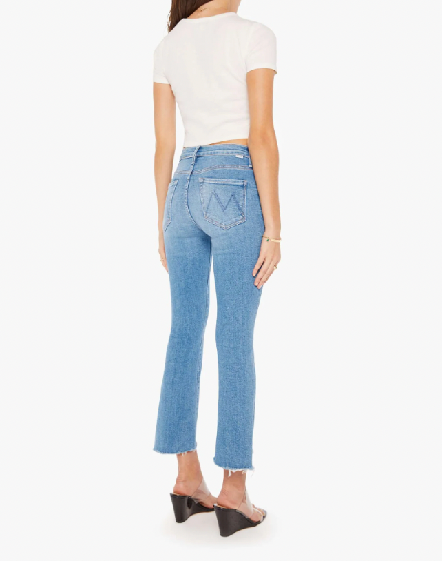 Mother's iconic high-waisted bootcut hits at the ankle with a frayed step-hem. Cut from stretch denim.