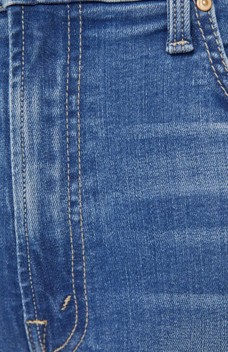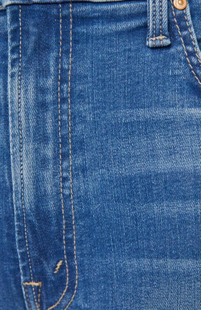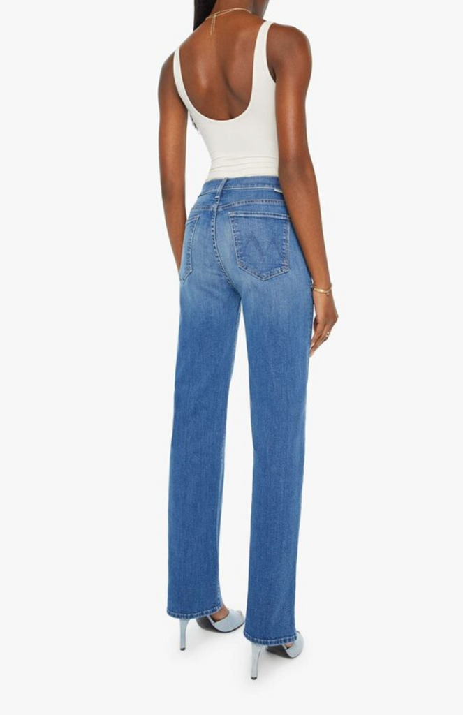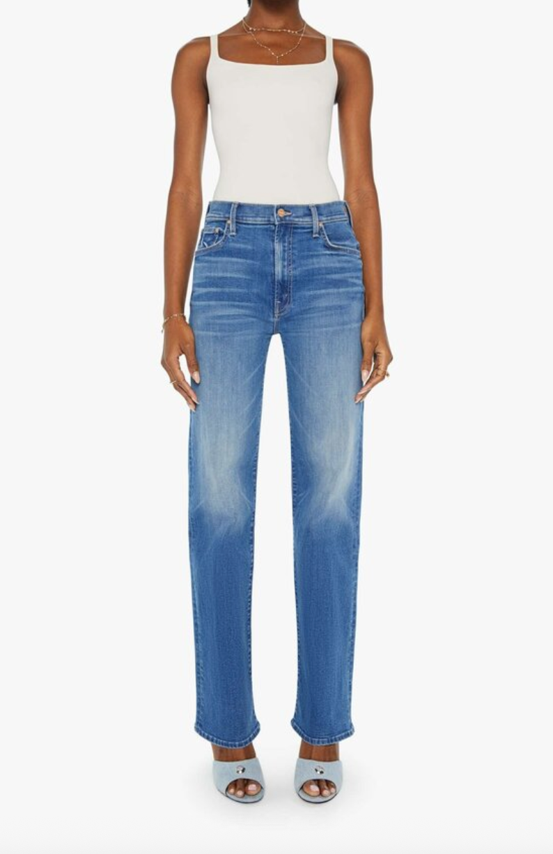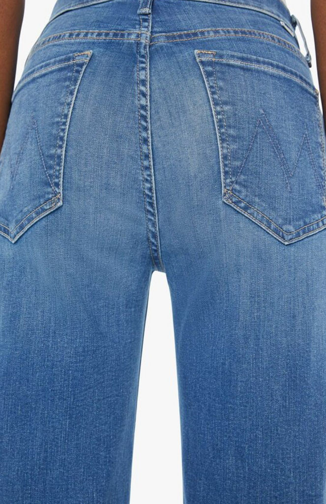 Crafted in soft stretch denim, The Rambler Zip Sneak jean from MOTHER features a high-rise waist, full-length inseam, and a wide straight-leg silhouette. Zip fly with button closure. Intentional light whiskering.