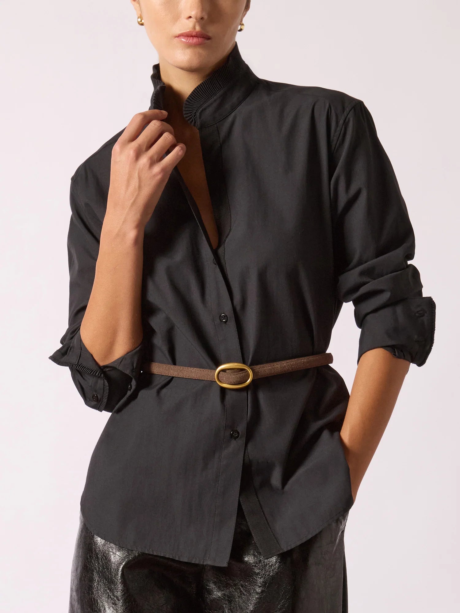 An elevated update to a classic, the Easton Shirt features heat-set ruffles at the collar and sleeve placket. Its slightly relaxed fit and grosgrain details on the front placket and cuffs add subtle sophistication for every day. 65% polyester/35% cotton. Measures approximately 27.5" in length. Model wears a Small.
