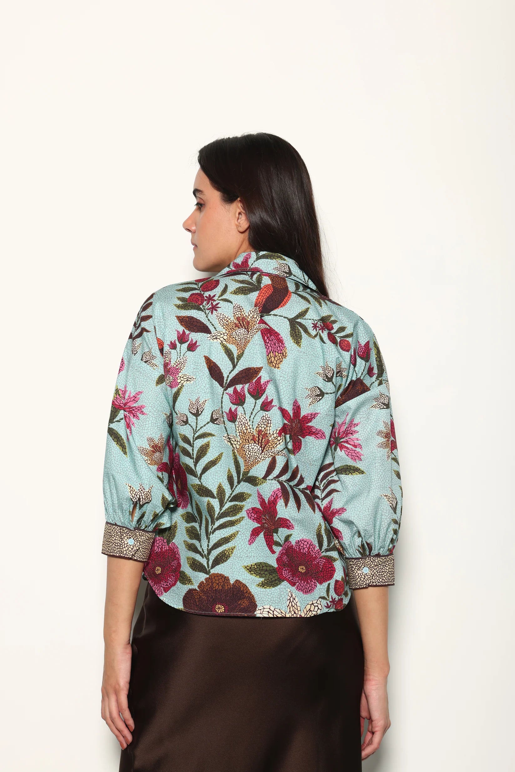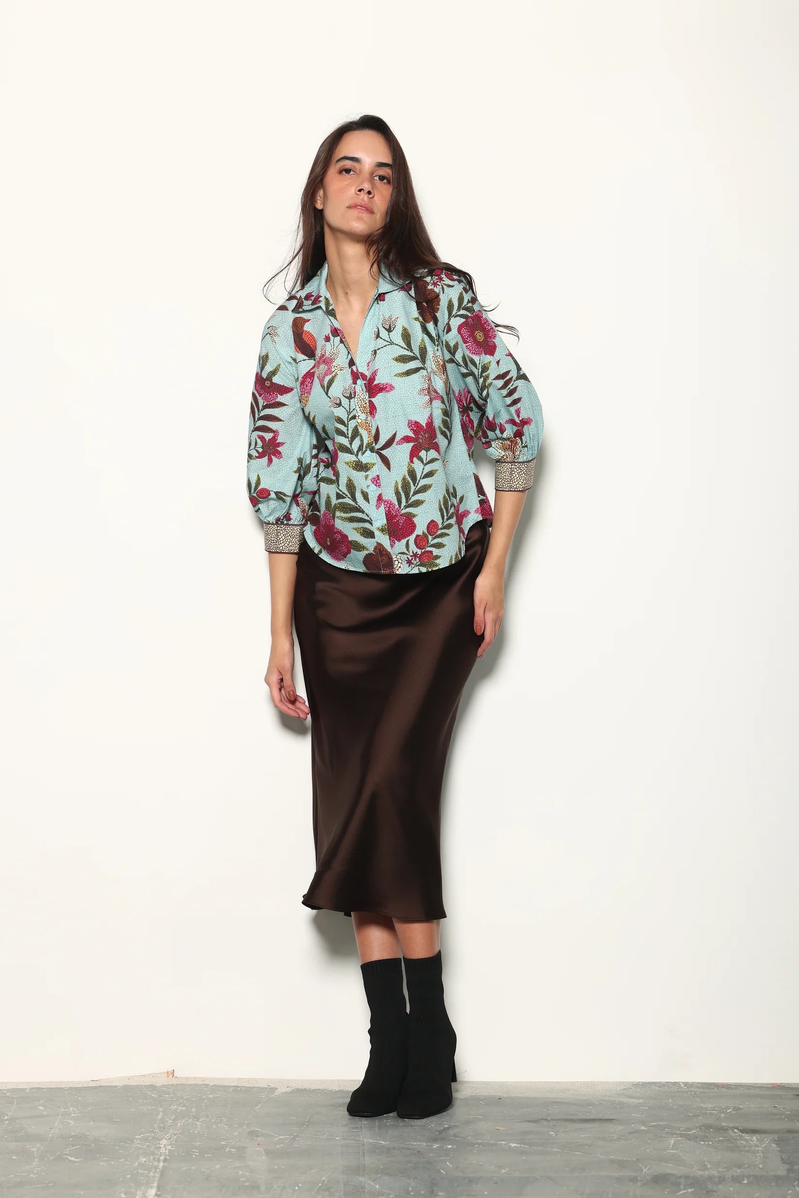 Maude Vivant crisp cotton blouse in a rich floral and bird print. V-neckline with collar and button front. Flattering 3/4 length sleeves.