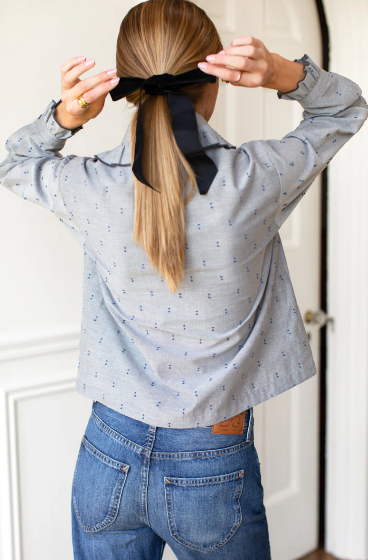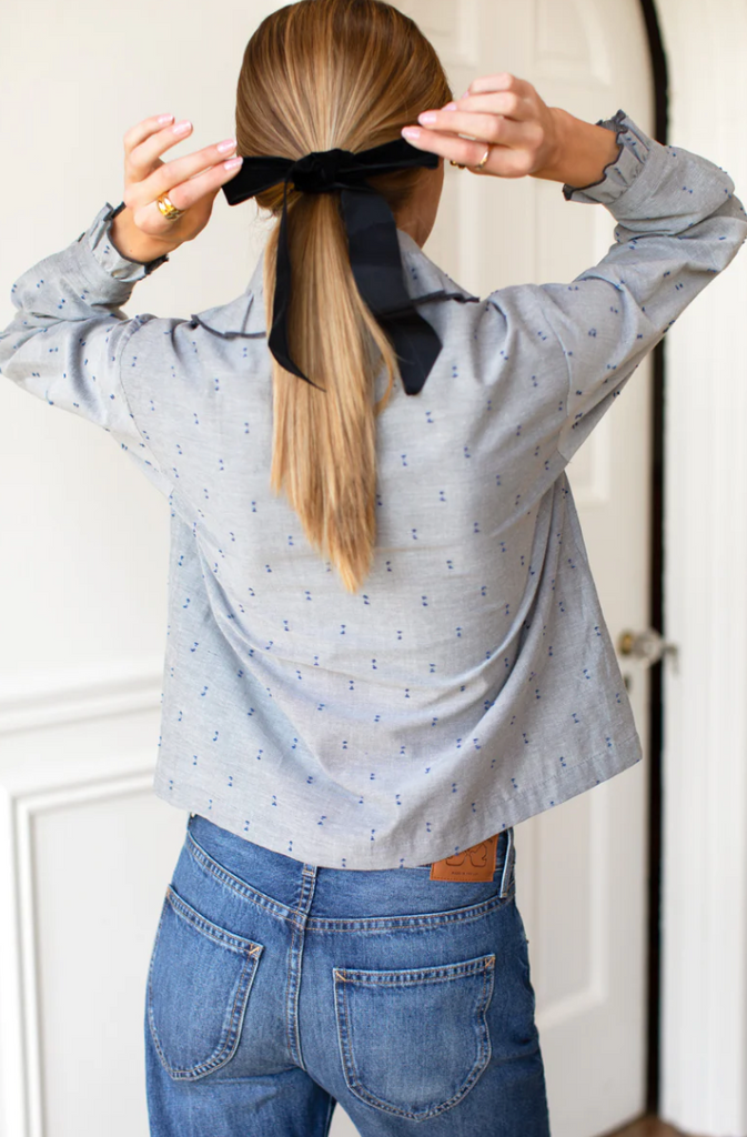 Lightweight cotton blouse with Peter Pan-style collar. Ruffle details at collar, button placket and sleeve cuff. Front shell button closures. Pintuck detailing at front. Speckled dot detailing woven throughout