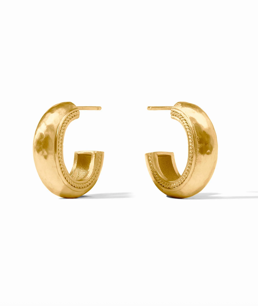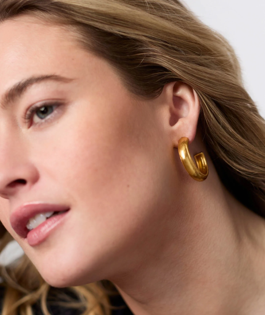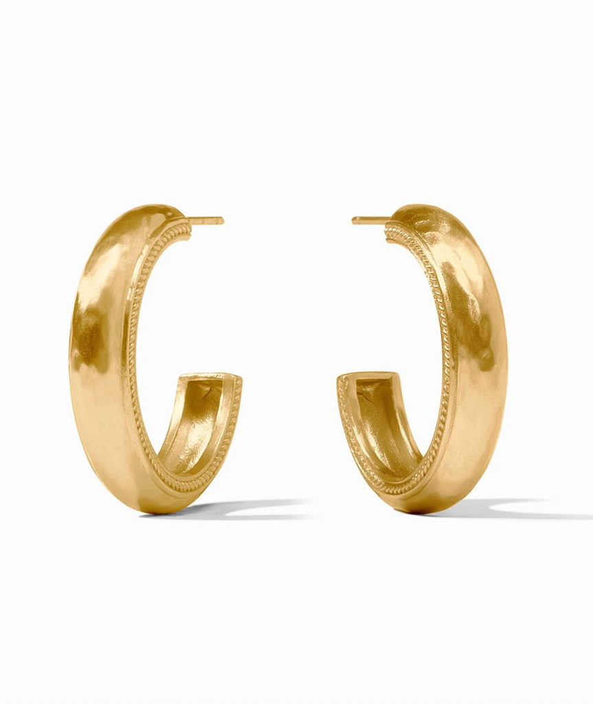 24K gold plate hoop with tiny edged beading. Post and back for pierced ears.