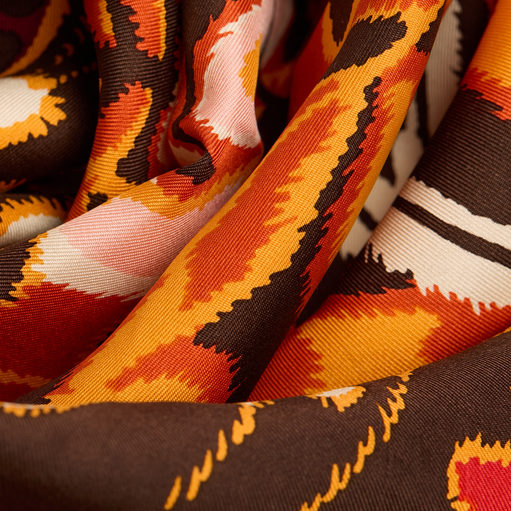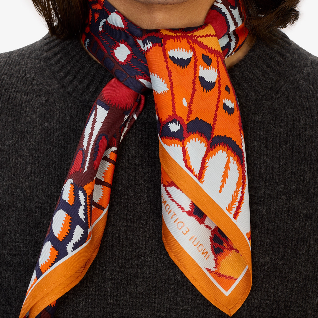 A staple at Inoui Editions for several seasons now, the square scarf is now a staple in their collections. It brings art and clothing together and is a playful and versatile part of any outfit. The 25.5" square, silk scarf can be worn around the neck or tied around the handle of a bag.