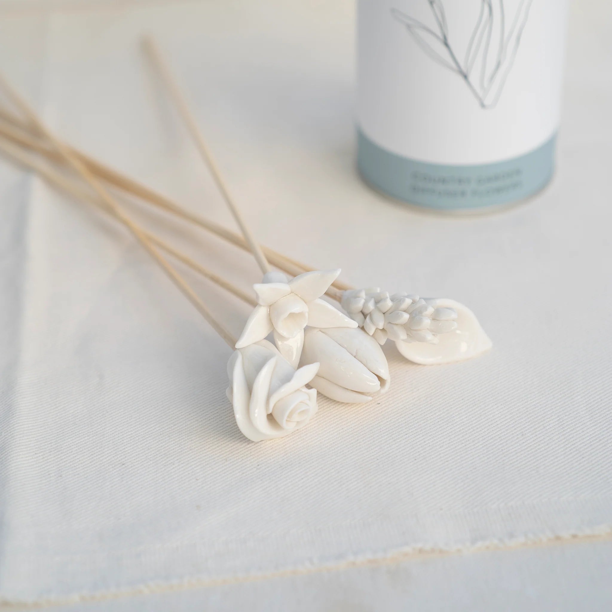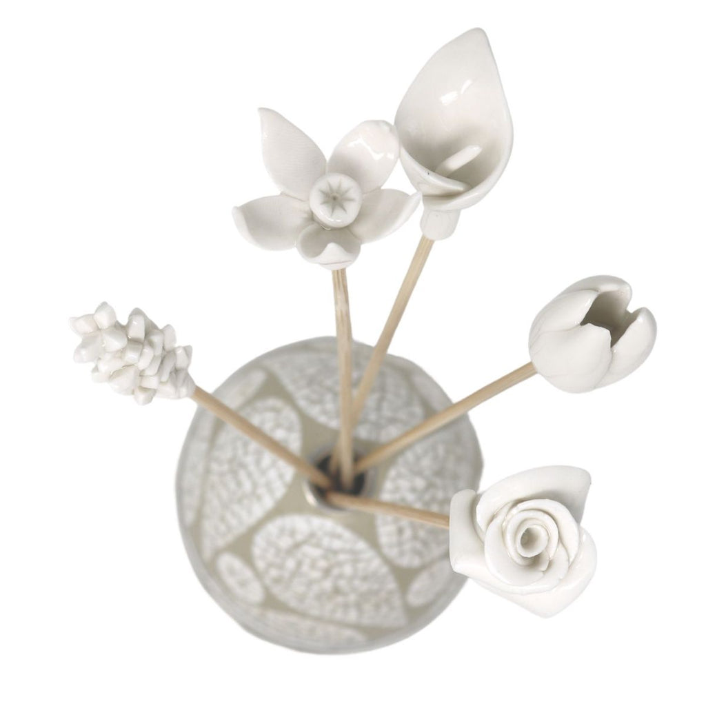 Exquisite, hand-sculpted, porcelain blooms mounted on bamboo stems. This reusable set features five floral delights: the serene white Rose, the joyful Daffodil, the passionate Tulip, the calming Lavender, and the elegant Calla Lily.