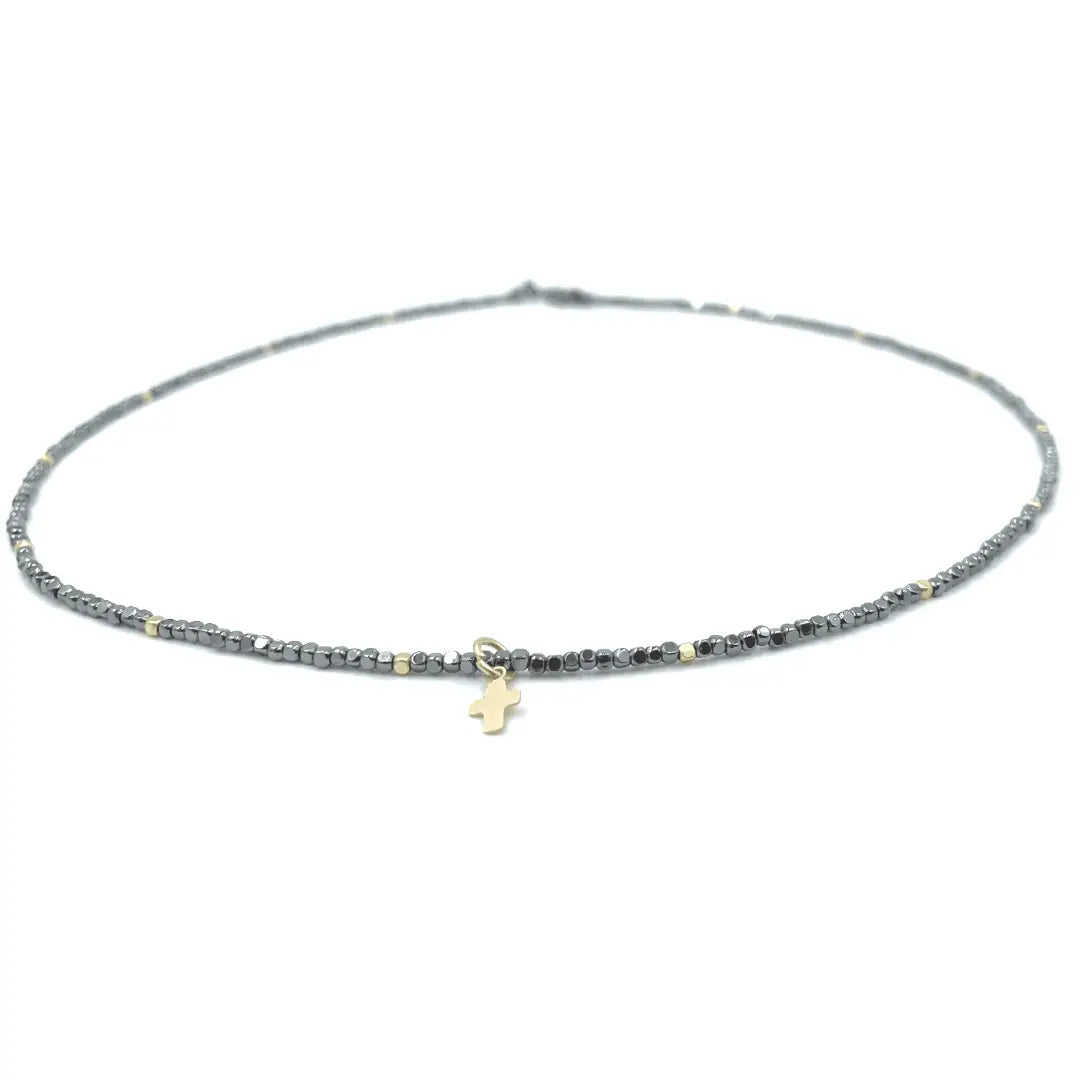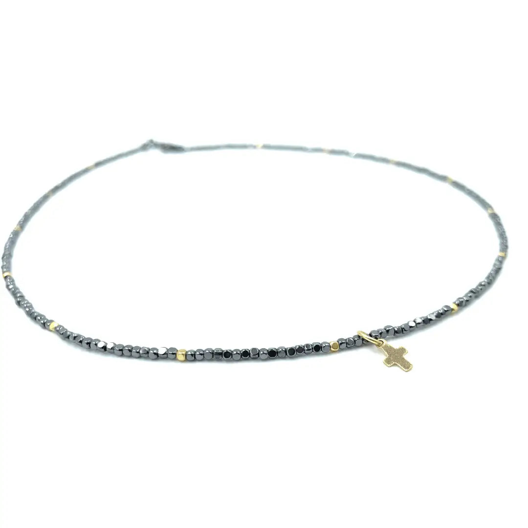 14k gold-filled luxe cross on erin gray's gunmetal hematite + gold minimalist necklace.
