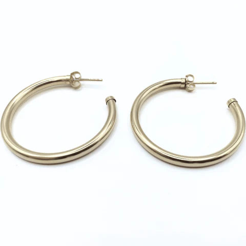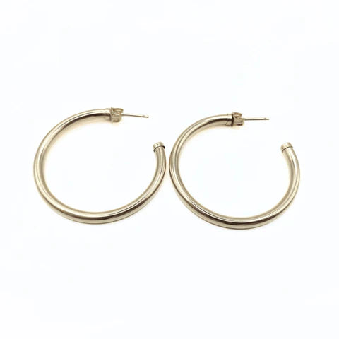 Meet your favorite new hoop! Erin Gray's 14K gold-filled post hoops are impressive in thickness, yet light as air.  3mm thick. Waterproof. Will not tarnish.  Perfect for daily wear and travel. 14K Gold Filled studs and backs.