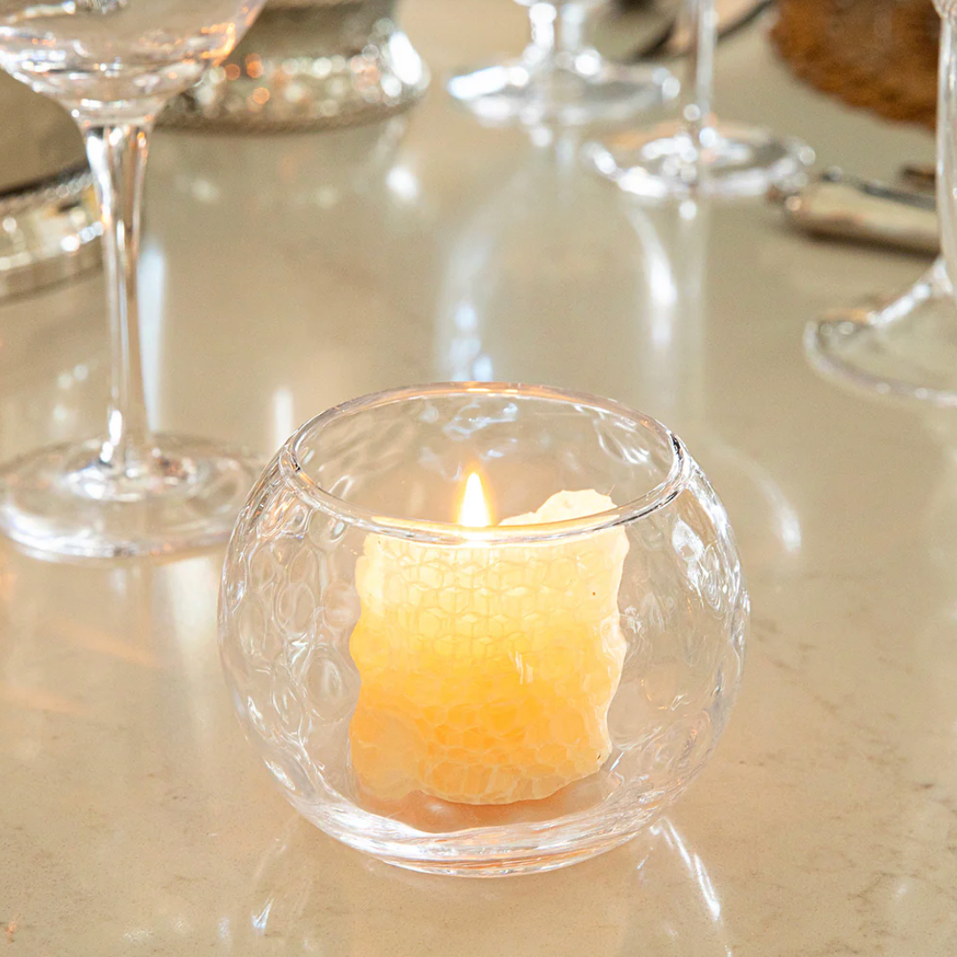 When the twinkle of candlelight meets the dappled-sunlight texture of our Puro glass, the effect is a dance of shimmer-upon-shimmer that never fails to cast an utterly enchanting glow wherever you place these petite sparklers, from dining table to hidden nook to bedside table. These tea lights are especially lovely when clustered in multiples for dramatic effect.