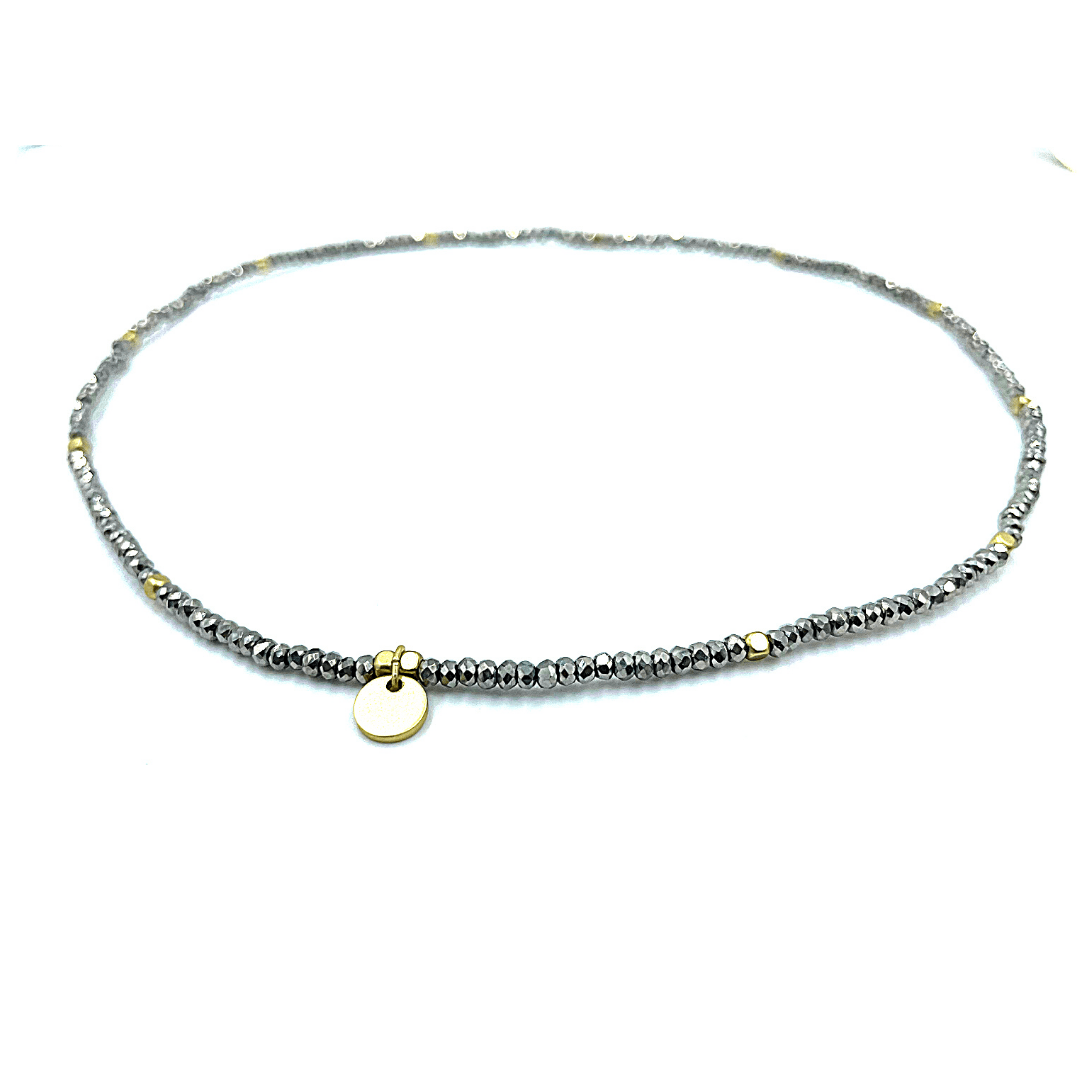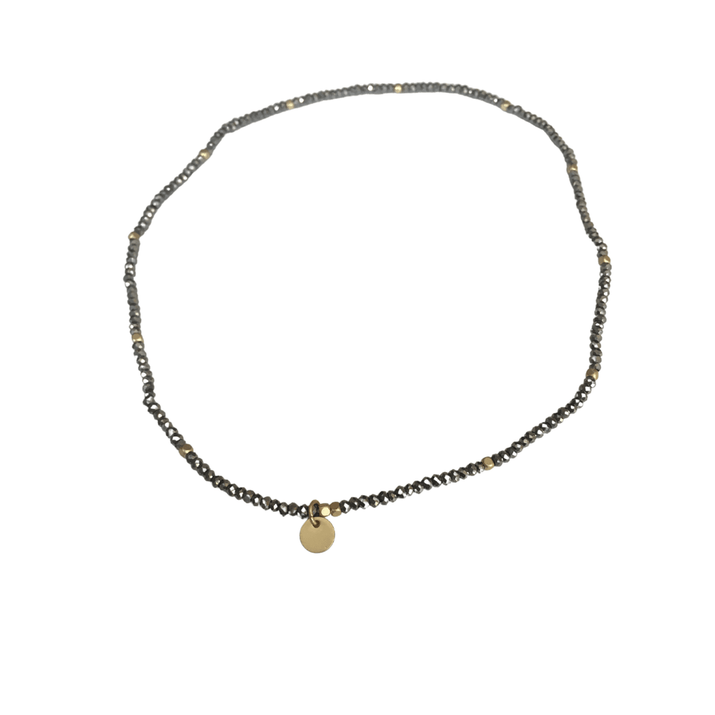 An erin gray classic stretch choker. Pyrite beads surround this necklace with gold-filled beads and a dainty gold-filled dot circle charm. Wear it alone or layer with others.
