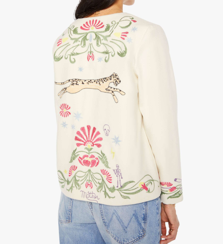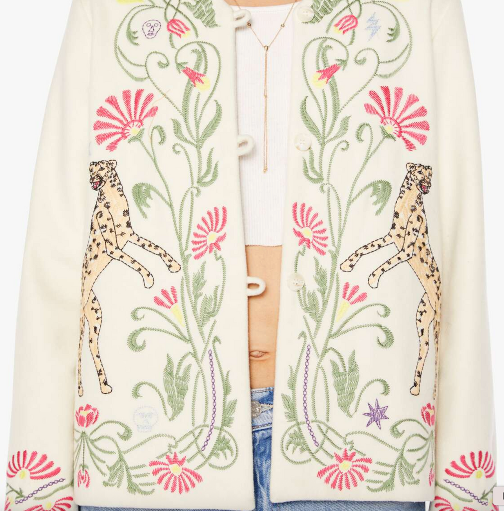 On the prowl. A V-neck jacket with buttons down the front and a relaxed, boxy fit. Ally Cat Antics is a creamy, off-white with embroidered floral details, cheetahs and vines throughout. 50% Wool 50% Polyester.