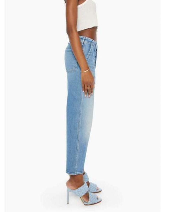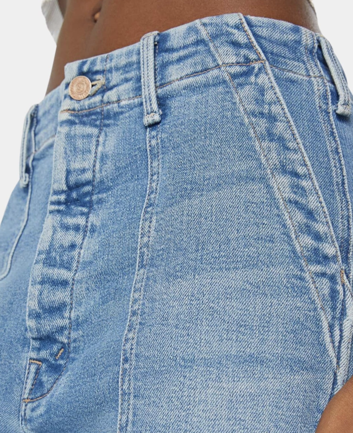 On the lookout. Super high-waisted pants with a wide straight leg, button fly, oversized patch pockets and a cropped inseam. Made from a blend of recycled denim with a touch of stretch, Flag Me Down is a light-blue wash with whiskering and fading at the knees.